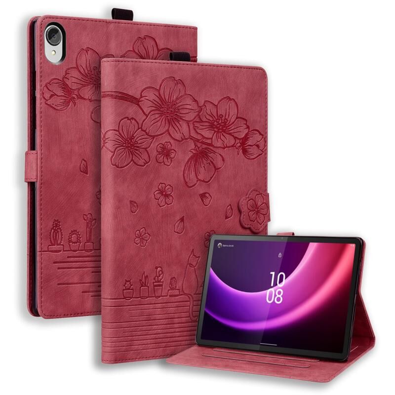 For Lenovo Tab P11 TB-J606F Cartoon Sakura Cat Embossed Leather Tablet Case(Red)