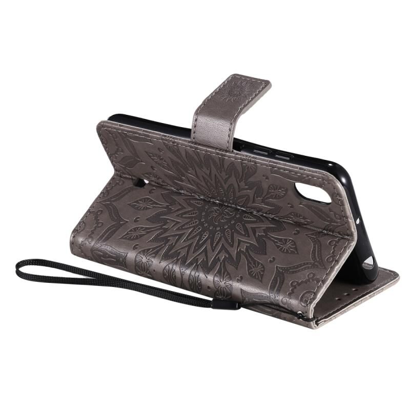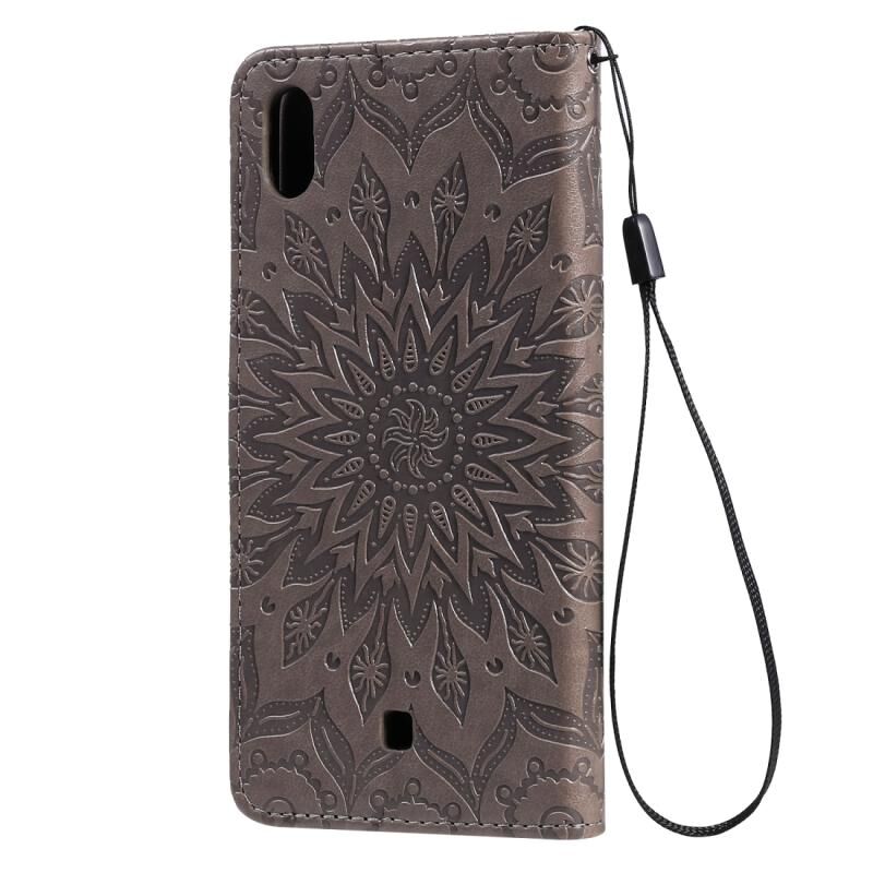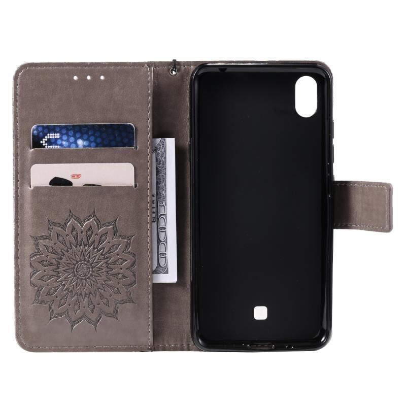 Θήκη για LG K20 (2019) με σχέδιο ηλιοτρόπιου, οριζόντια, από δερματίνη PU με εκτύπωση, με βάση στήριξης, θήκες για κάρτες, πορτοφόλι & λουρί (Γκρι)