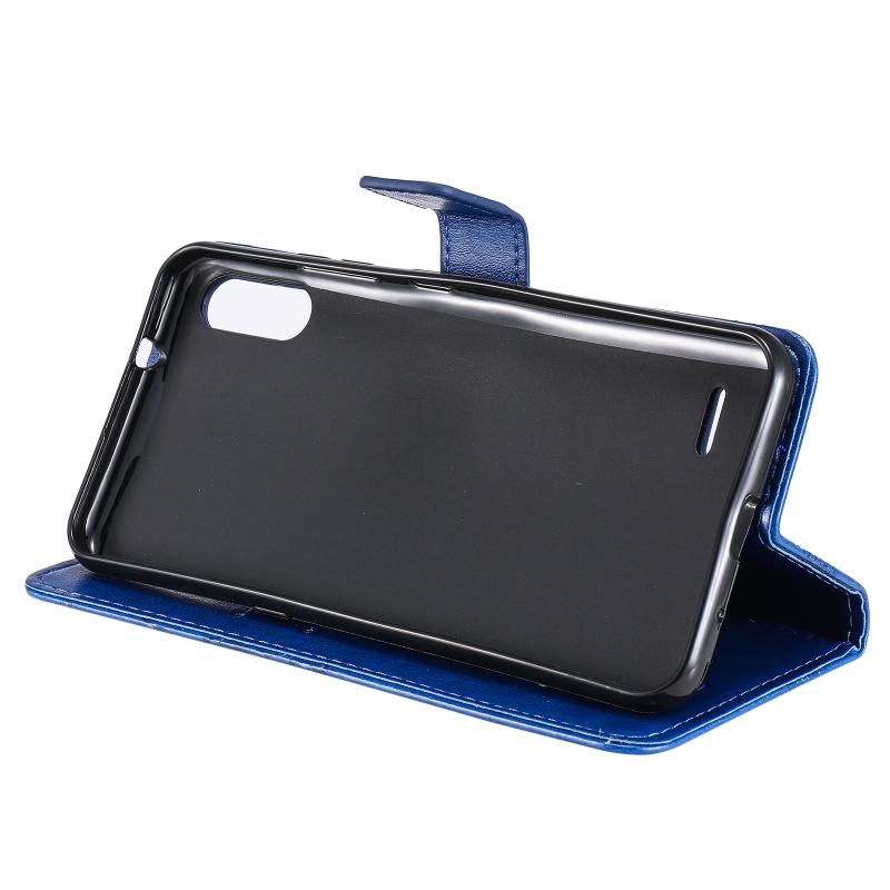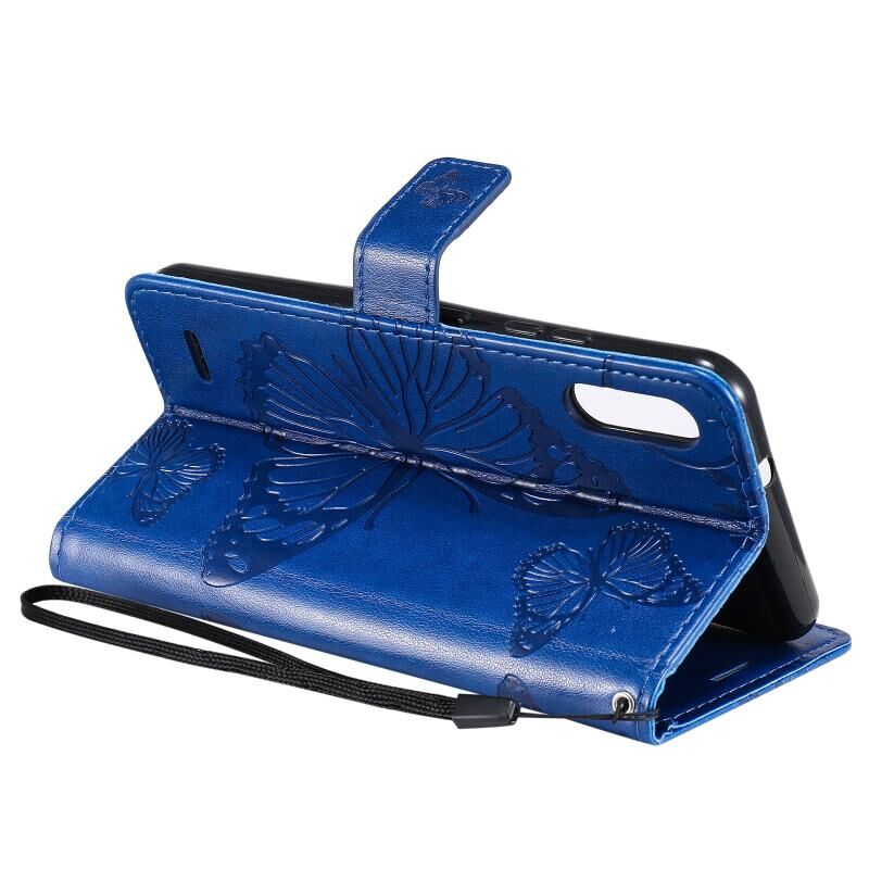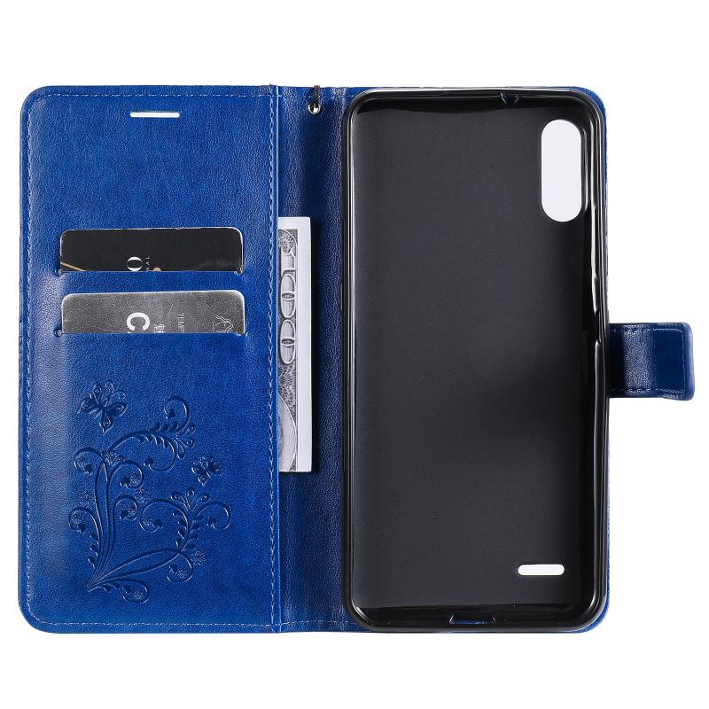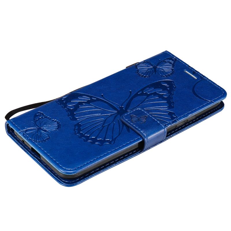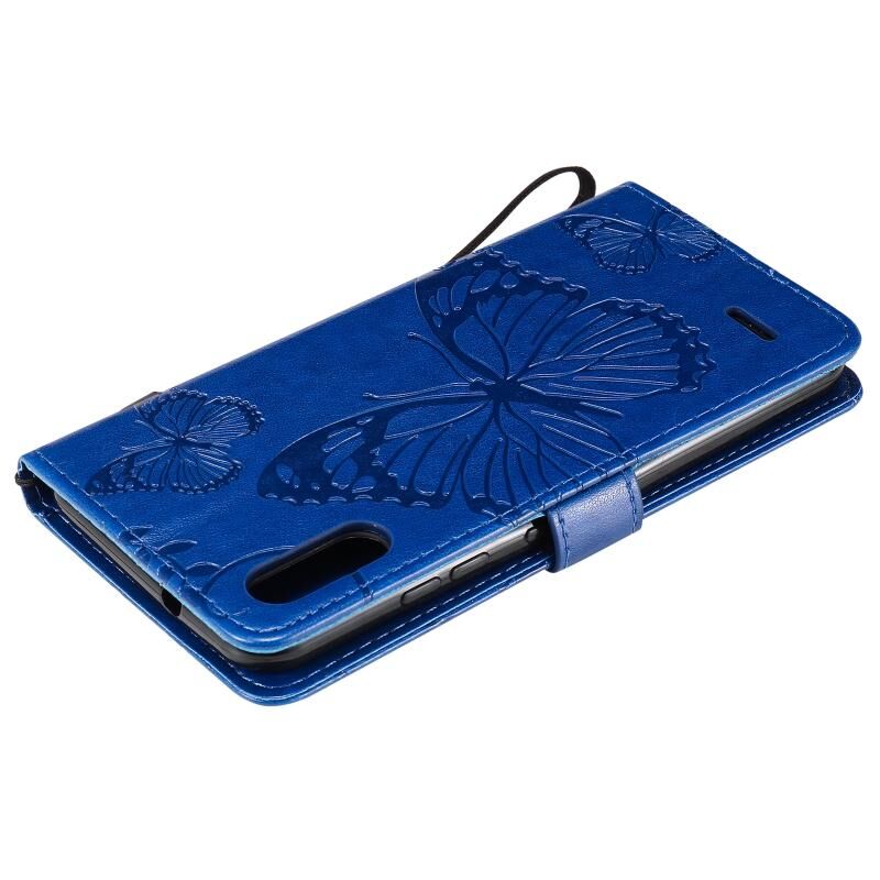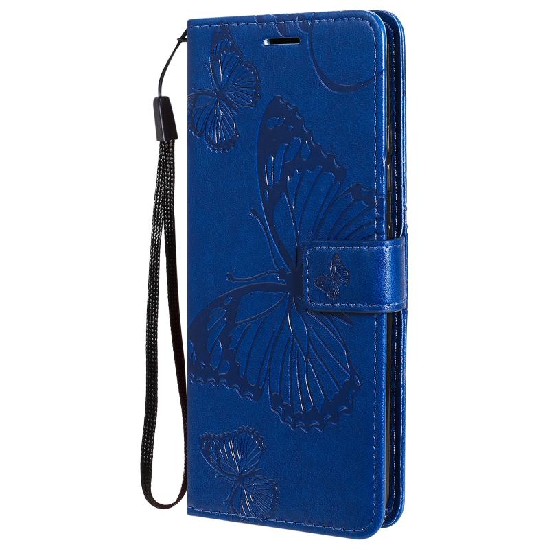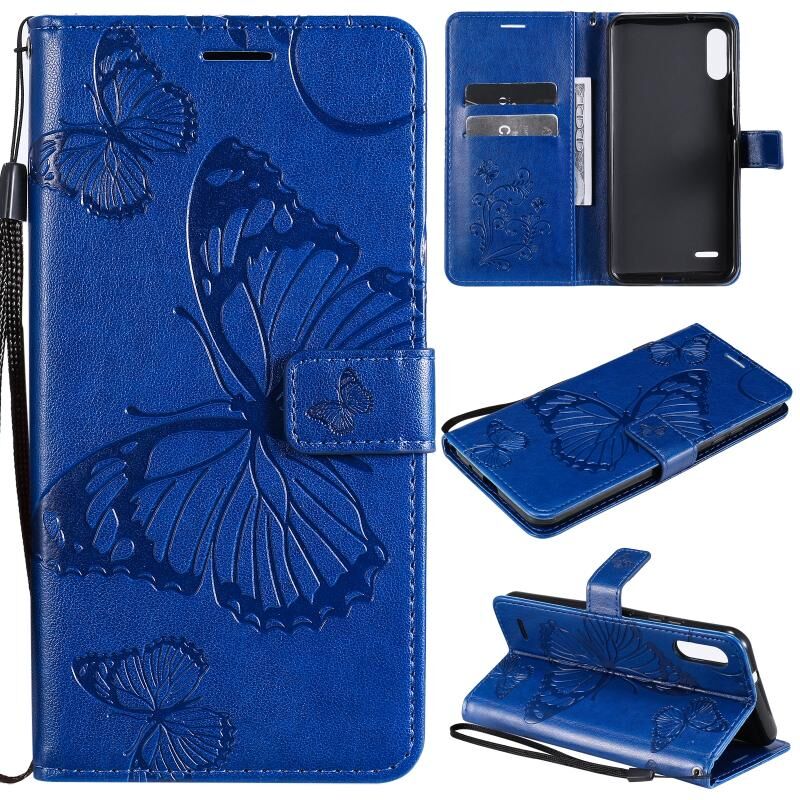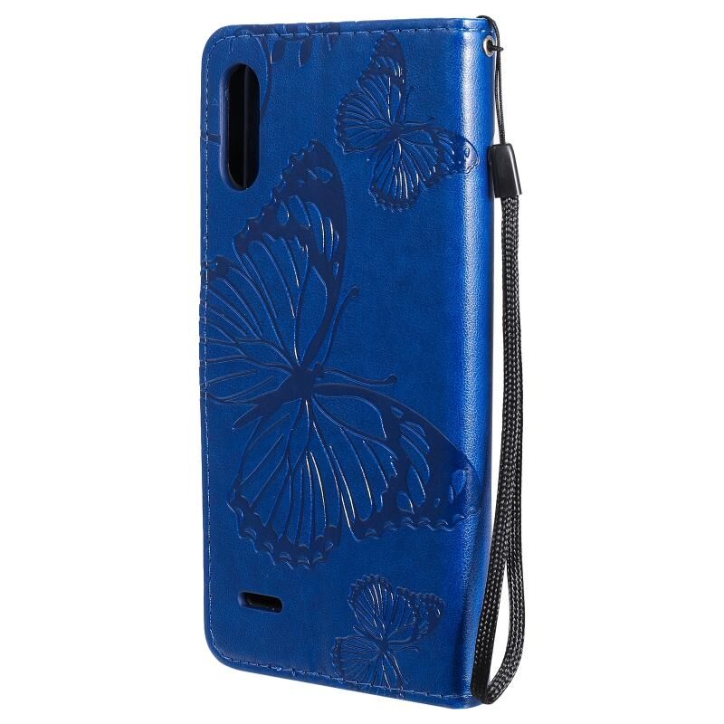 Θήκη δέρματος οριζόντιας αναδίπλωσης με ανάγλυφο σχέδιο 3D πεταλούδων για LG K22 / K22 Plus με βάση στήριξης & υποδοχή κάρτας & πορτοφόλι (Μπλε)