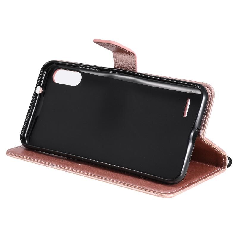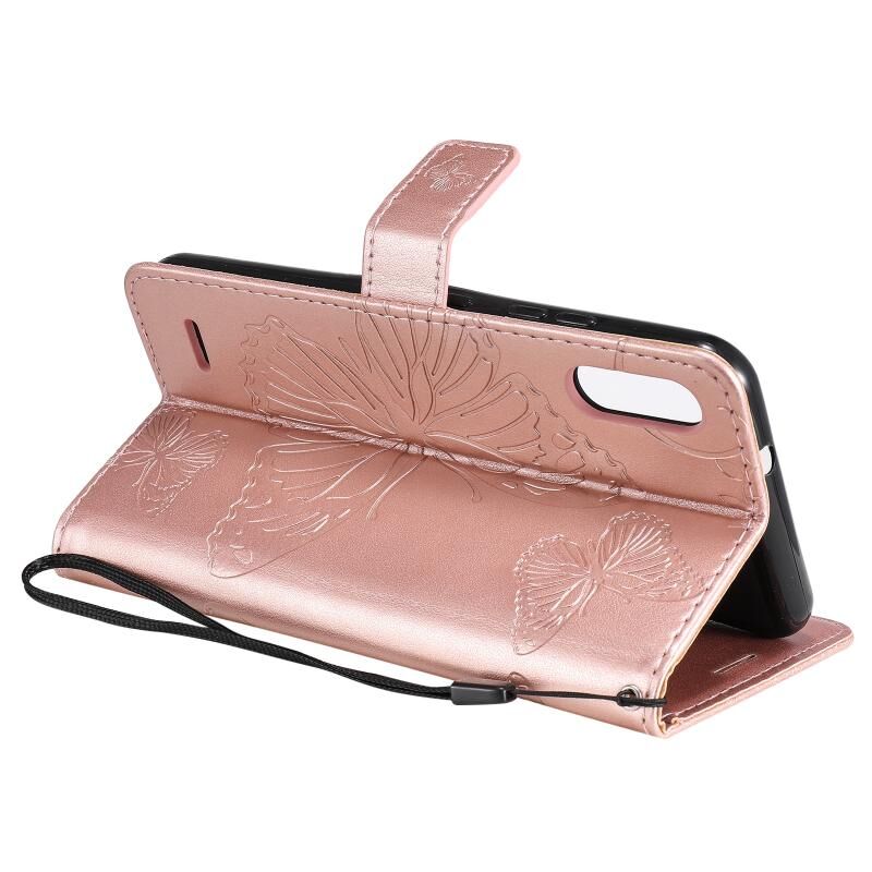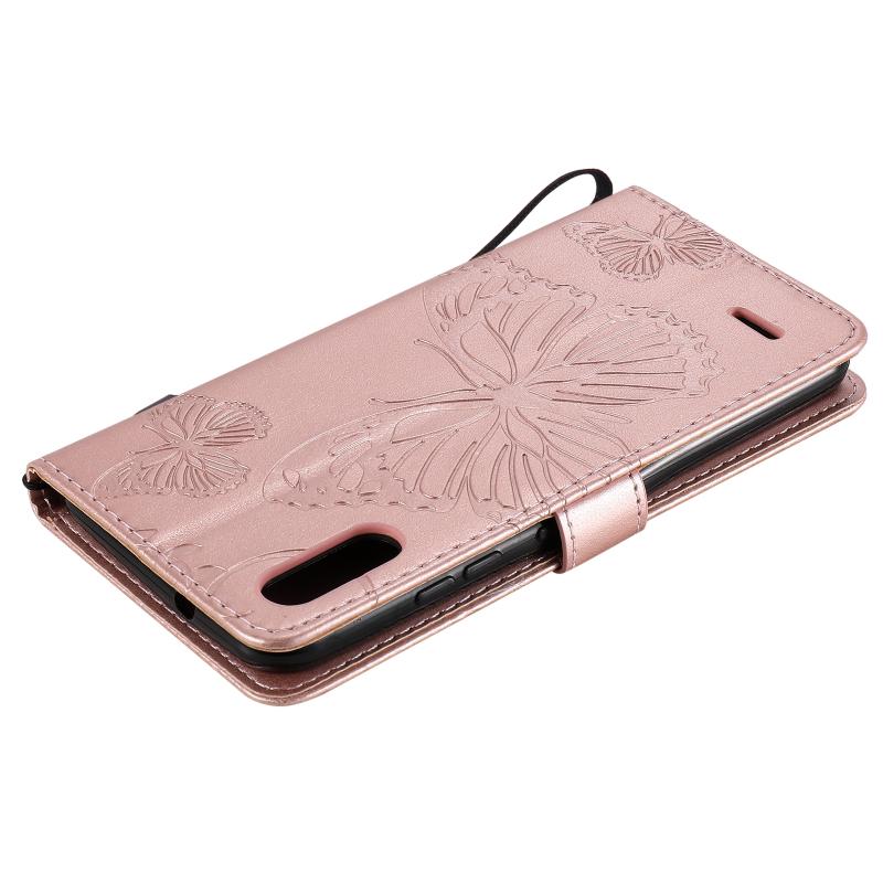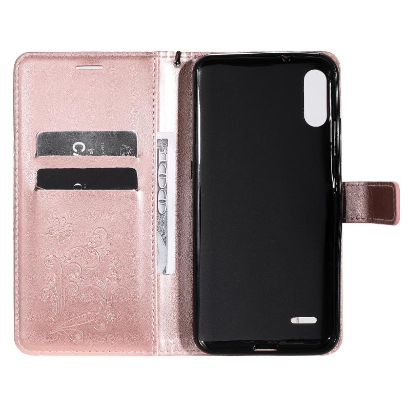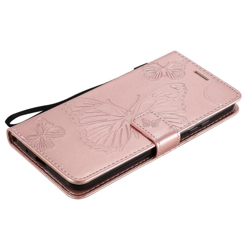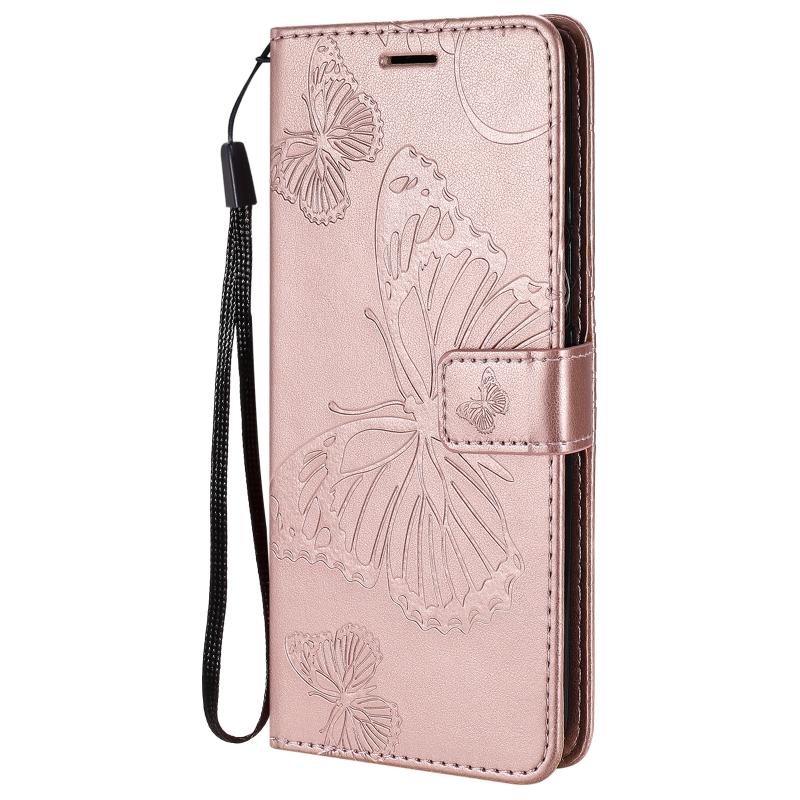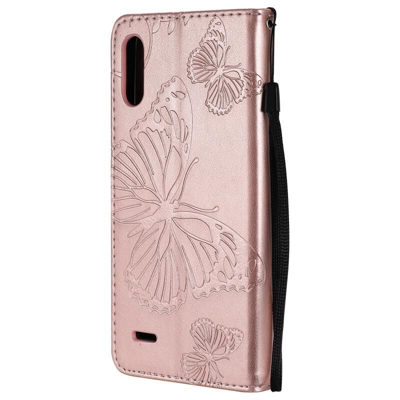 Θήκη δέρματος οριζόντιας αναδίπλωσης με ανάγλυφο σχέδιο 3D πεταλούδων για LG K22 / K22 Plus με βάση στήριξης & υποδοχή κάρτας & πορτοφόλι (Ροζ χρυσός)