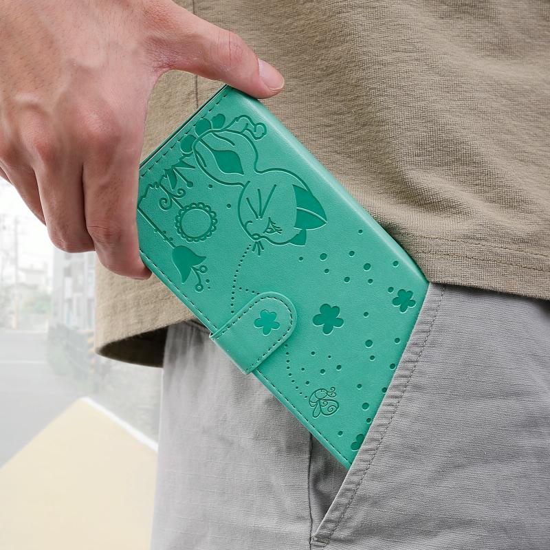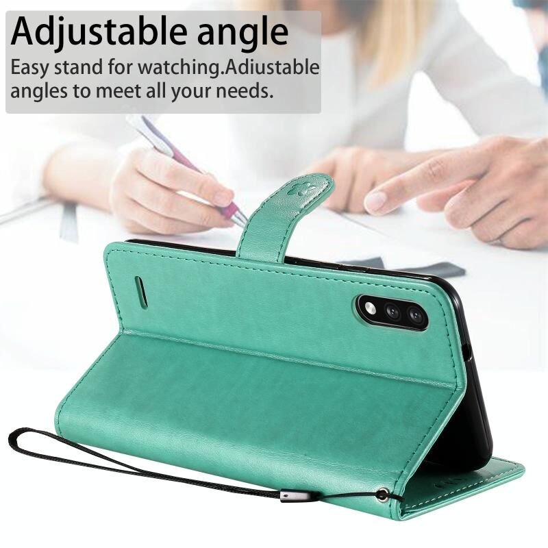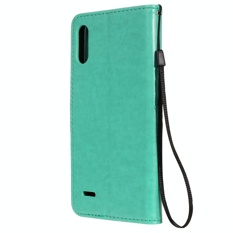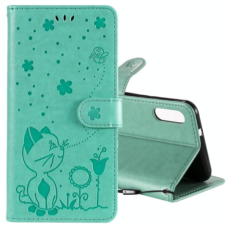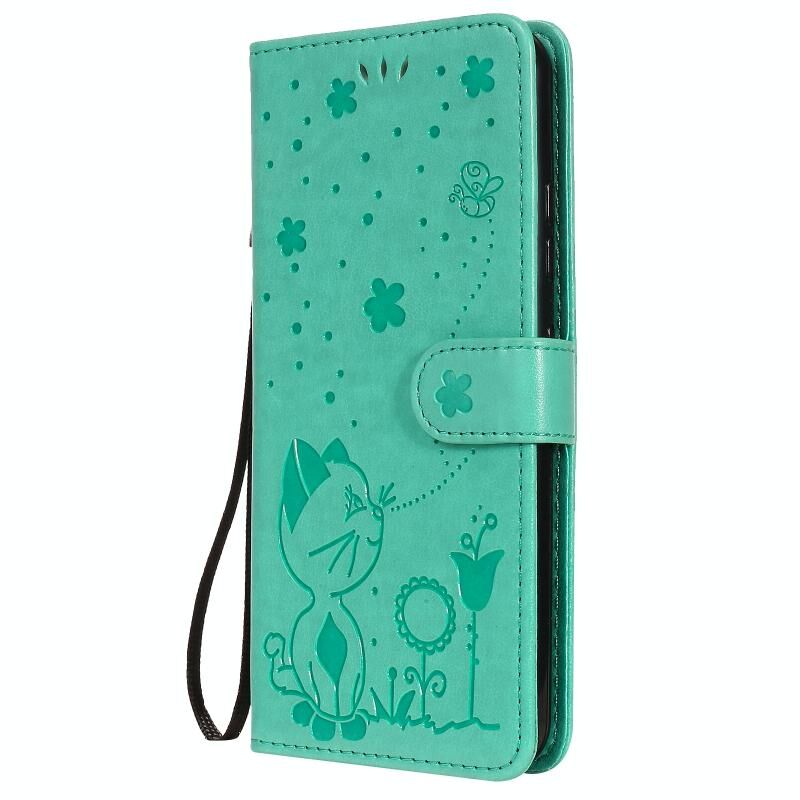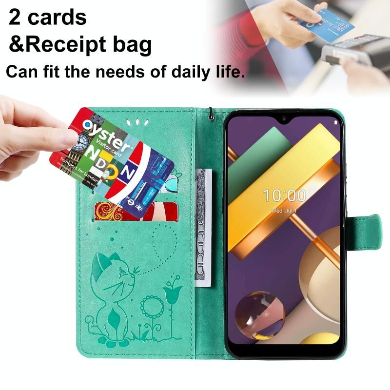 Θήκη δέρματος οριζόντιας αναδίπλωσης με σχέδιο ανάγλυφου Cat Bee, αντικραδασμική για LG K22 / K22 Plus με βάση στήριξης & υποδοχές καρτών & πορτοφόλι (πράσινο)