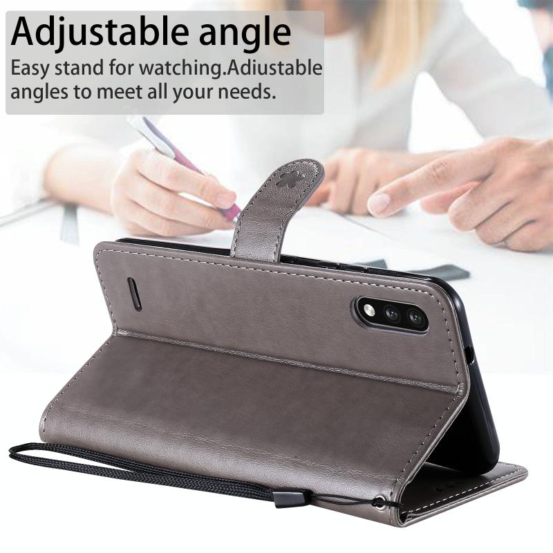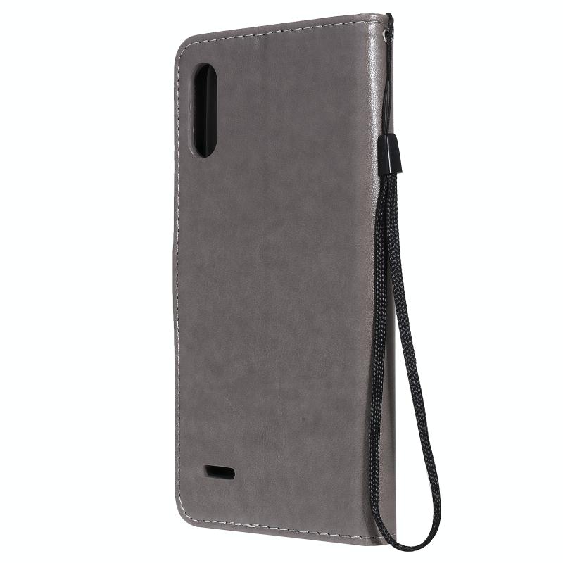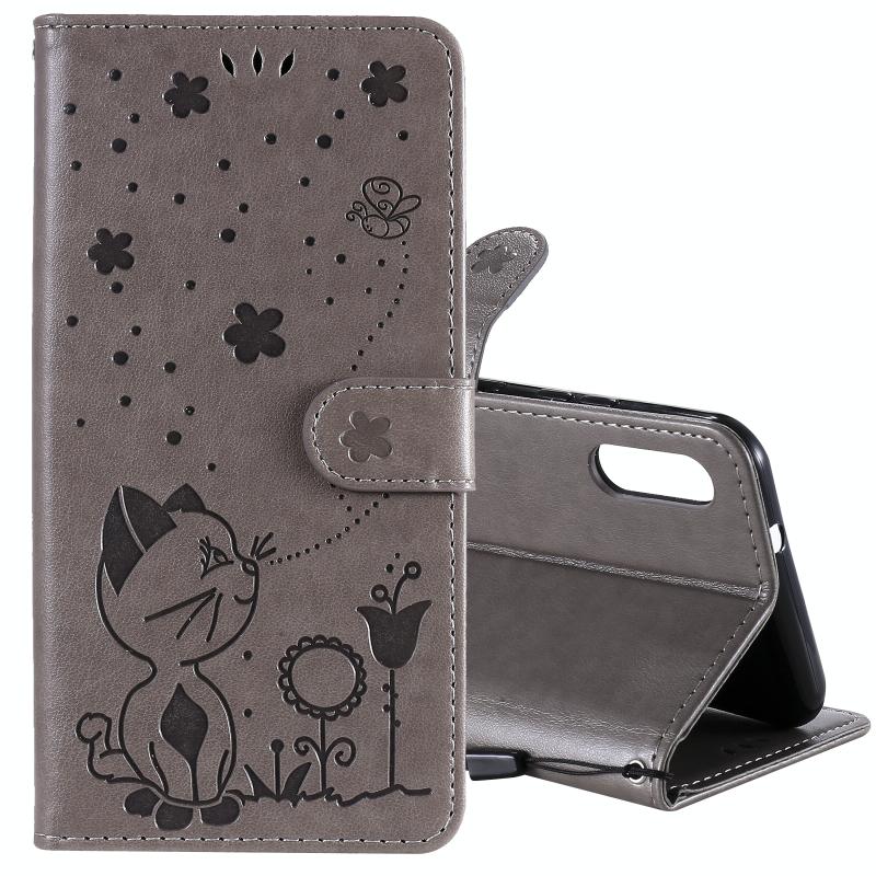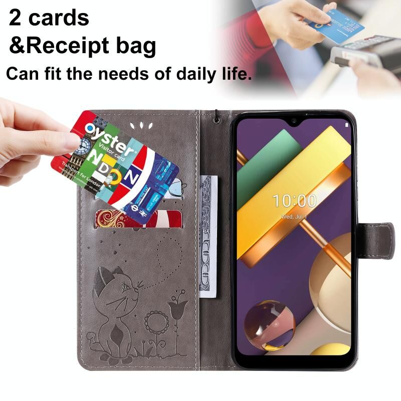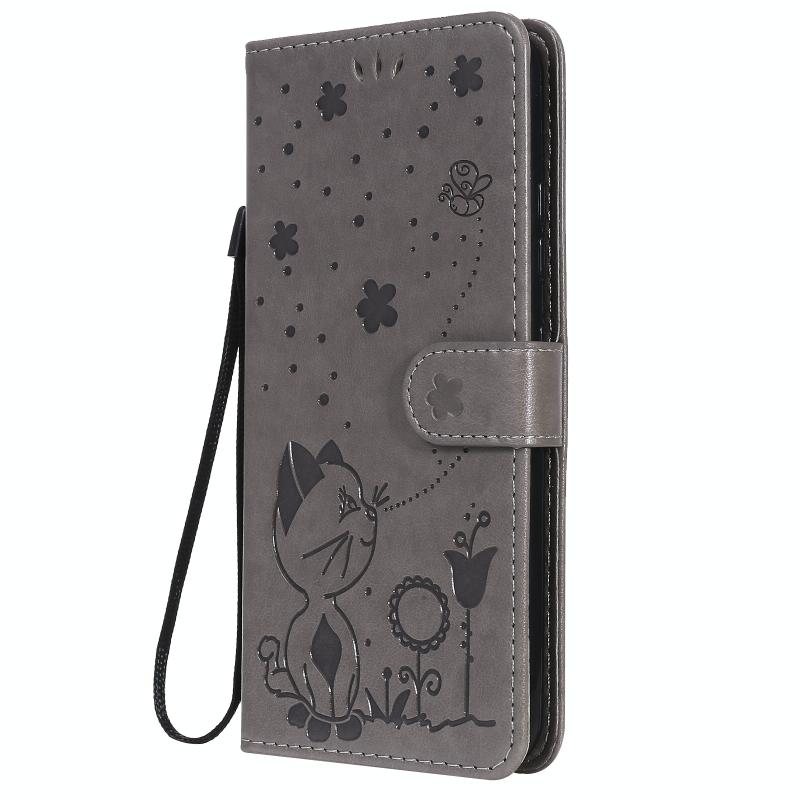 Θήκη δέρματος οριζόντιας αναδίπλωσης με σχέδιο ανάγλυφου Cat Bee, αντικραδασμική για LG K22 / K22 Plus με βάση στήριξης & υποδοχές καρτών & πορτοφόλι (Γκρι)