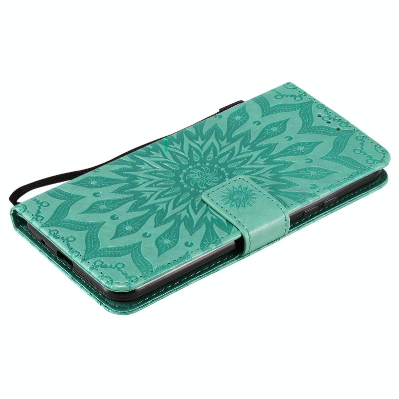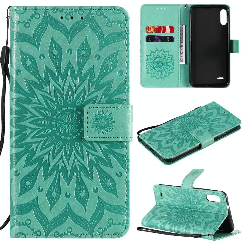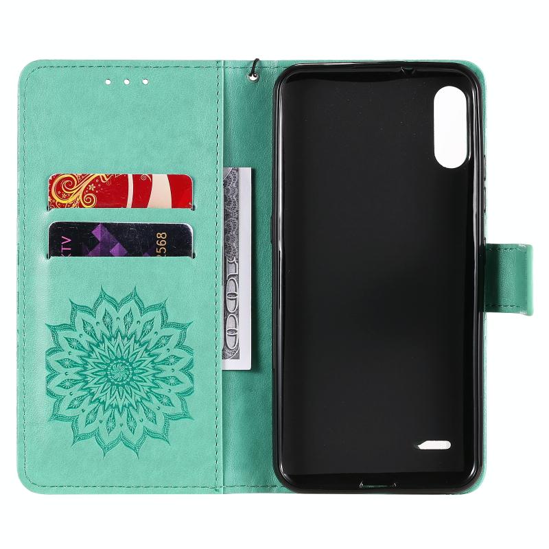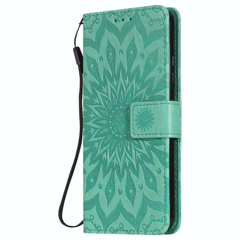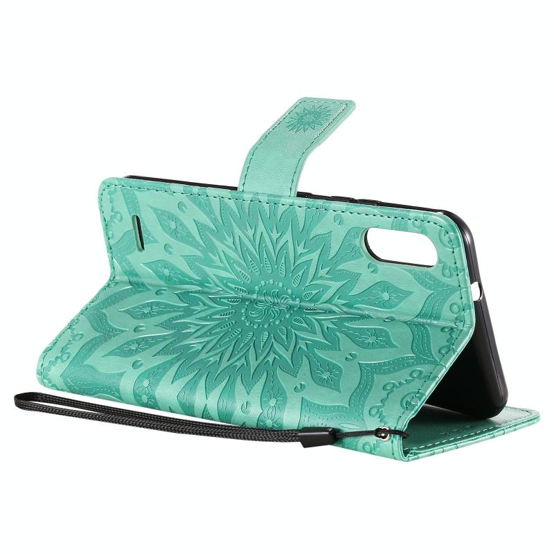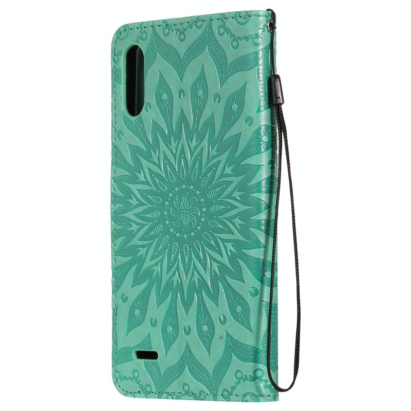 Θήκη δέρματος οριζόντιας αναδίπλωσης με ανάγλυφο σχέδιο ήλιου για LG K22 / K22 Plus με υποδοχή κάρτας & βάση & πορτοφόλι & κορδόνι (Καφέ)