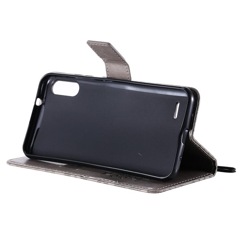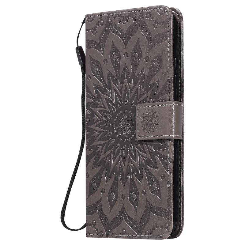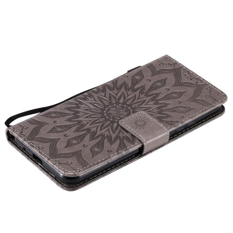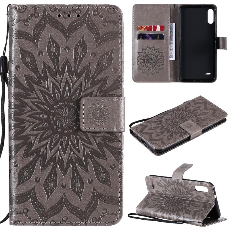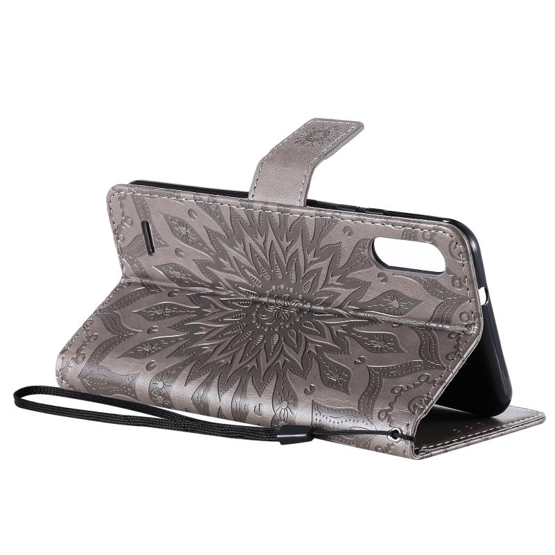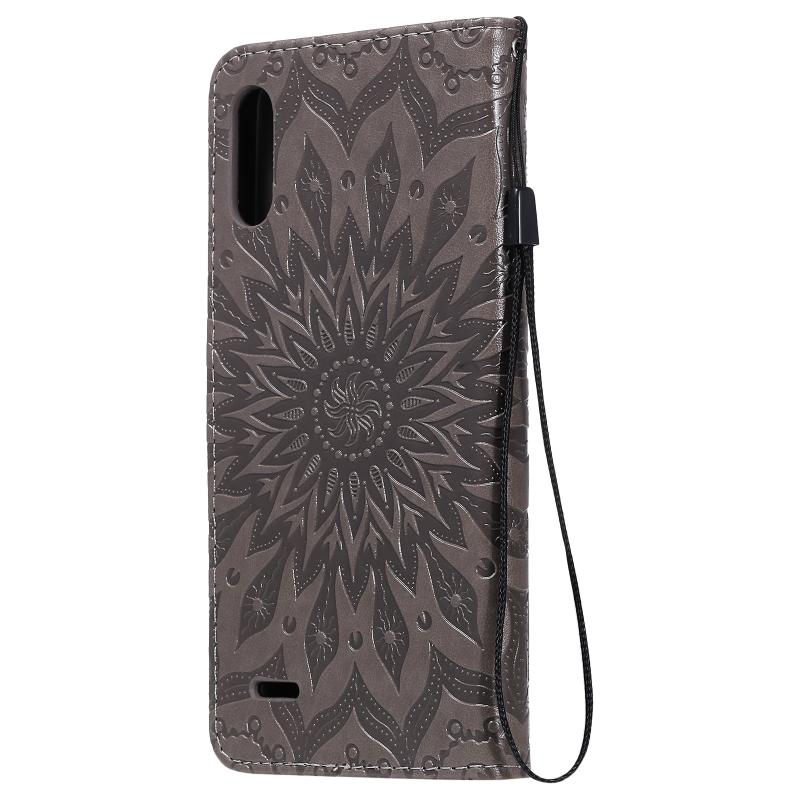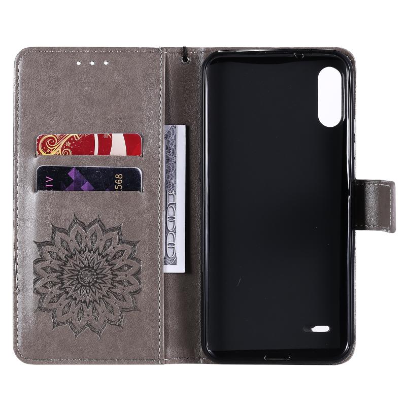 Θήκη δέρματος οριζόντιας αναδίπλωσης με ανάγλυφο σχέδιο ήλιου για LG K22 / K22 Plus με υποδοχή κάρτας & βάση & πορτοφόλι & κορδόνι (Καφέ)