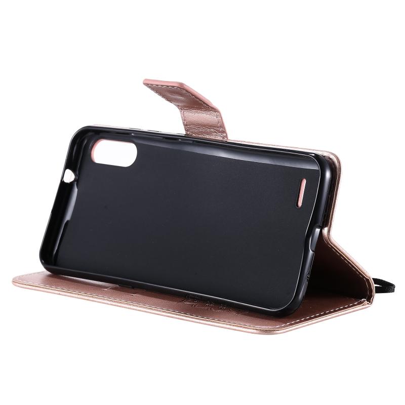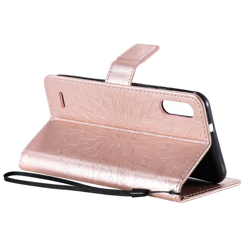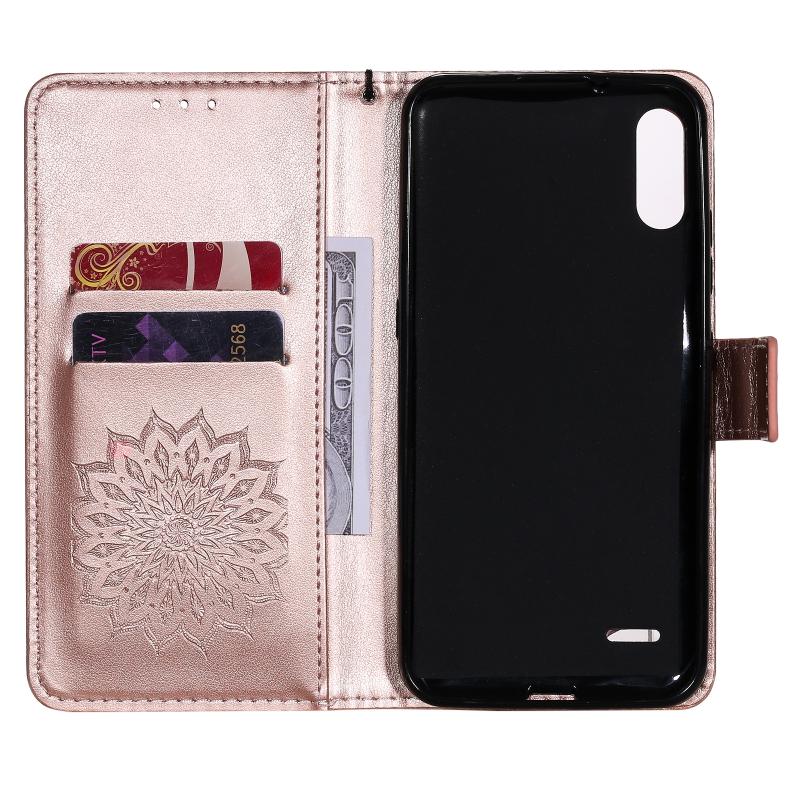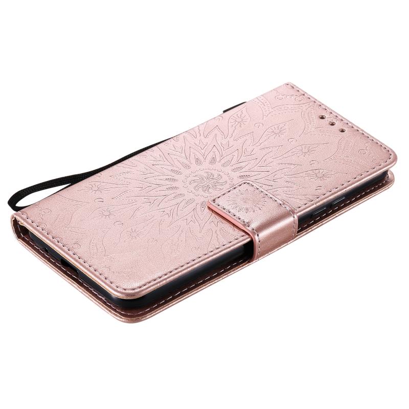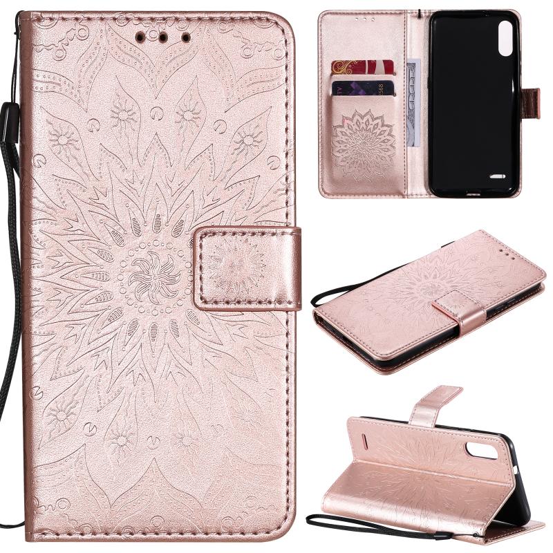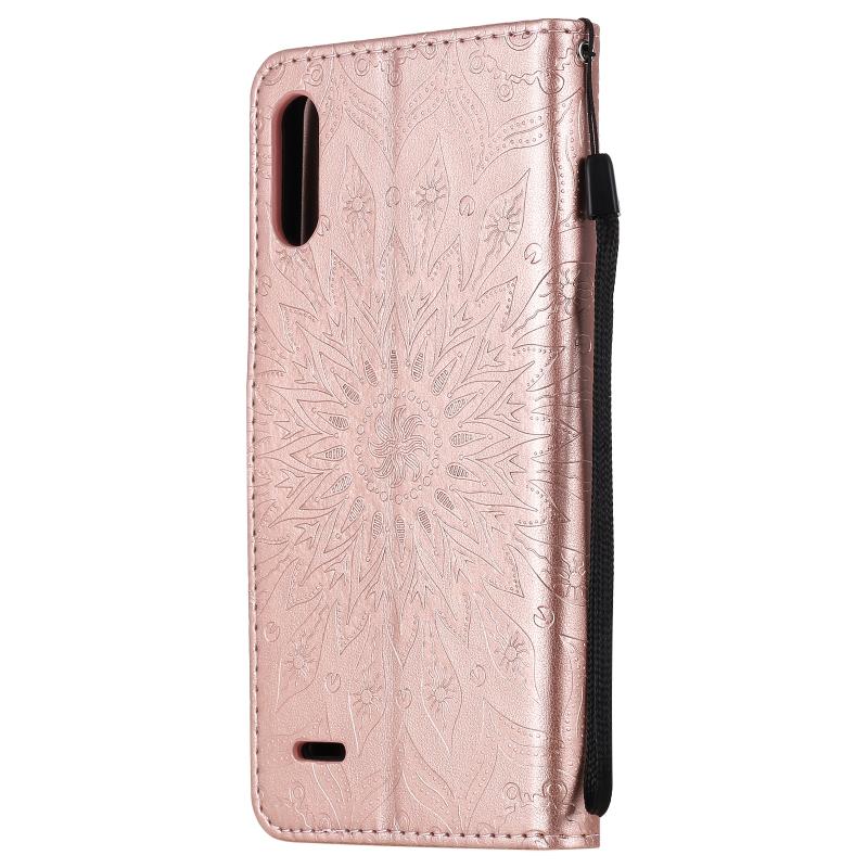 Θήκη δέρματος οριζόντιας αναδίπλωσης με ανάγλυφο σχέδιο ήλιου για LG K22 / K22 Plus με υποδοχή κάρτας & βάση & πορτοφόλι & κορδόνι (Καφέ)