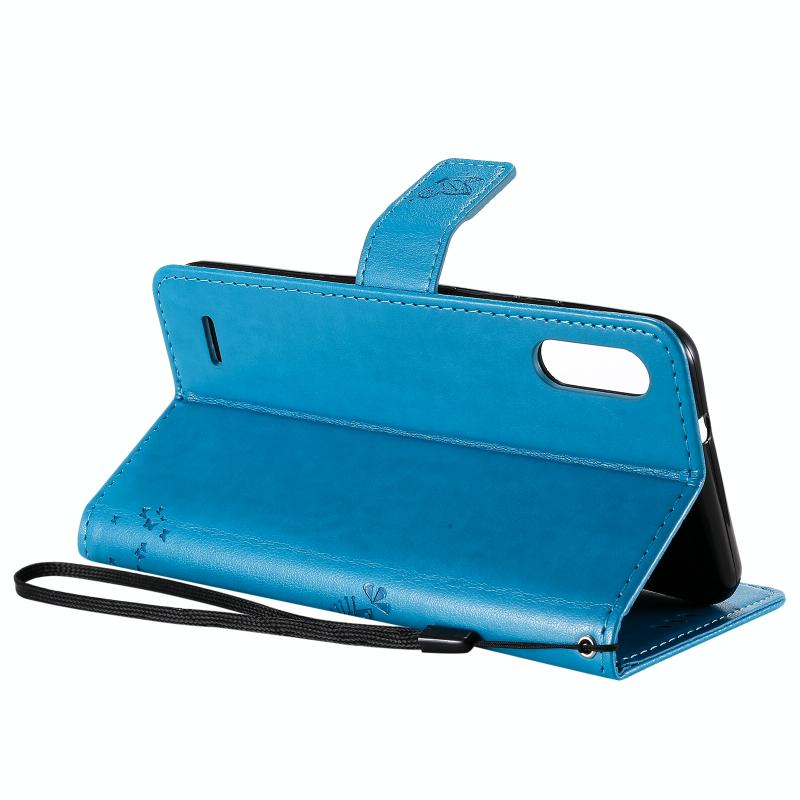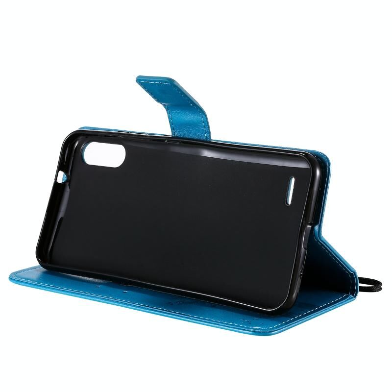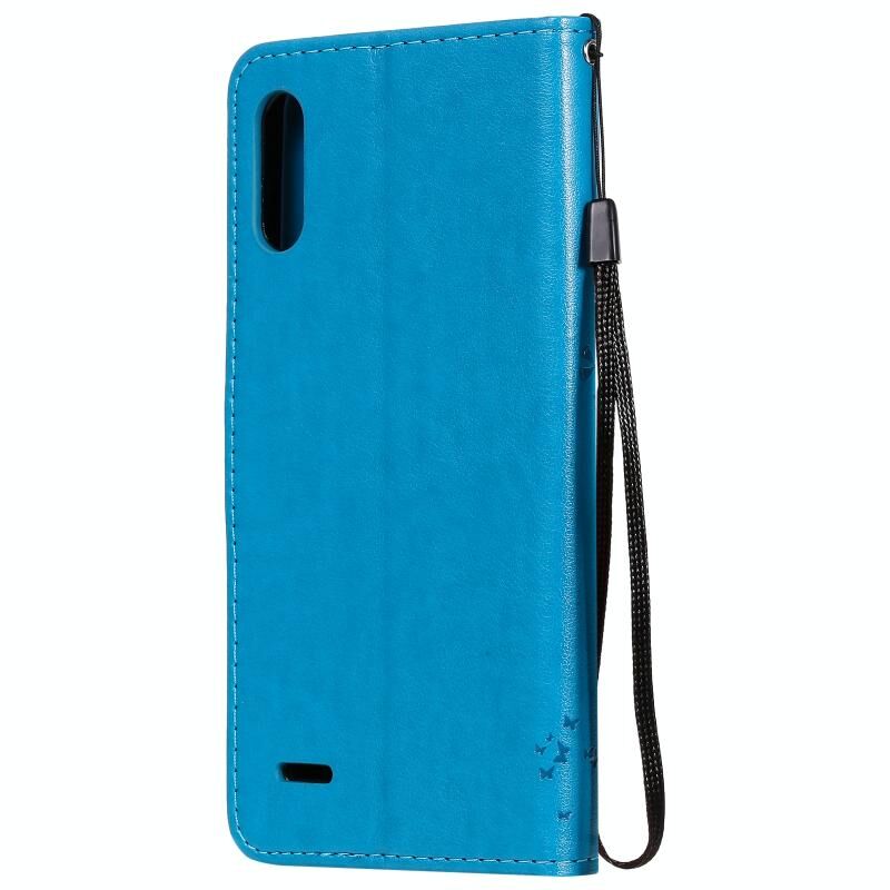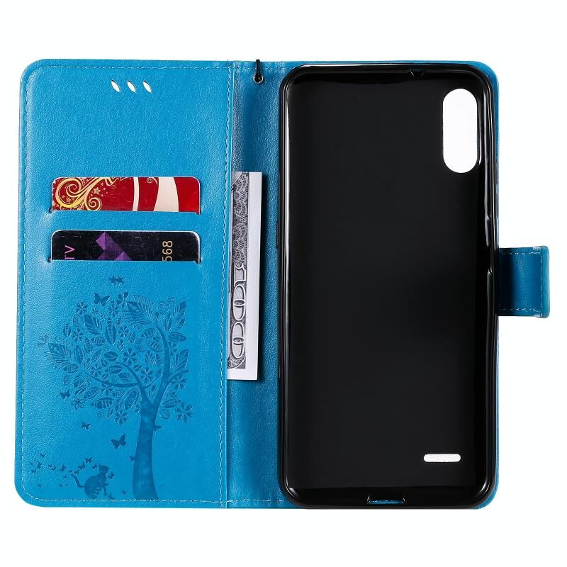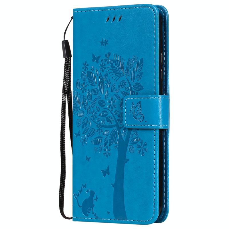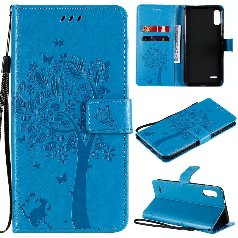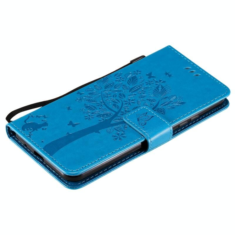 Θήκη για LG K22 / K22 Plus με σχέδιο Δέντρου & Γάτας, εκτυπωμένη με θερμοτύπηση, οριζόντια, από δερματίνη PU με βάση στήριξης, θήκες για κάρτες, πορτοφόλι & κορδόνι (Μπλε)