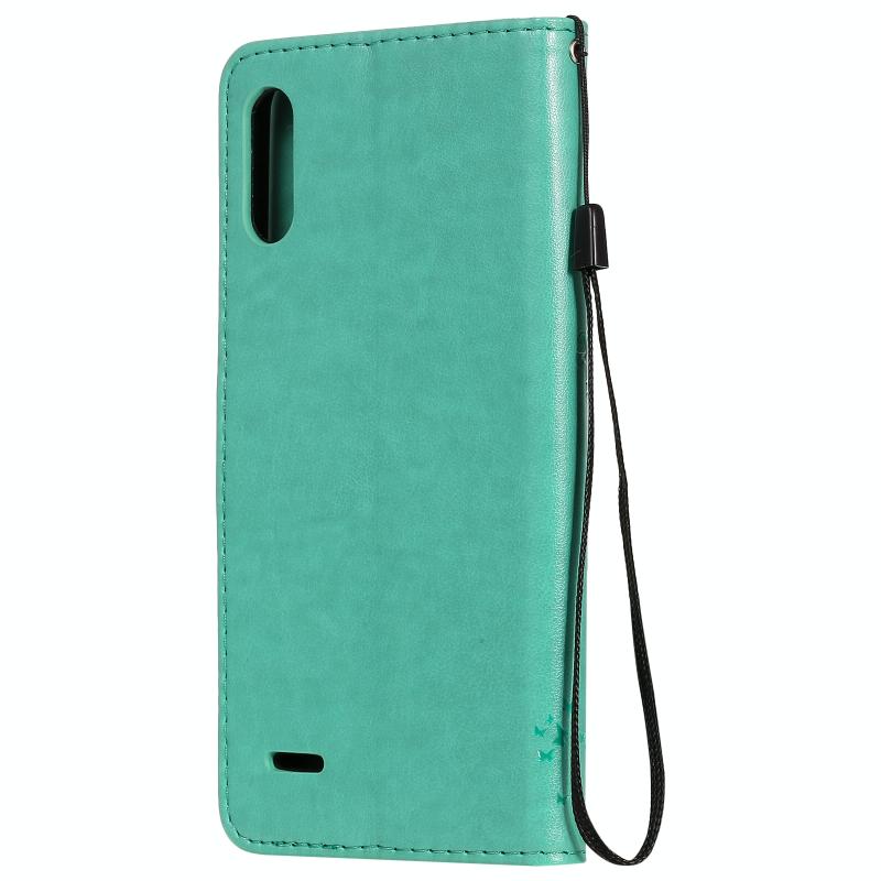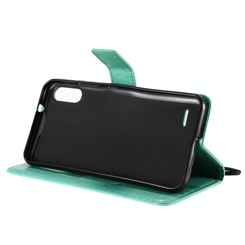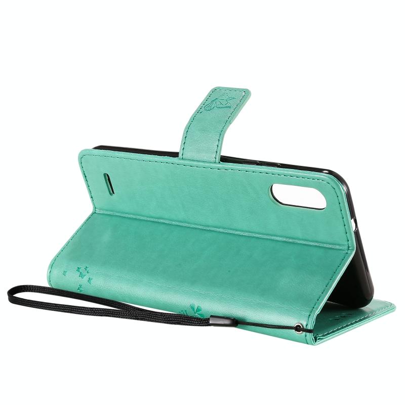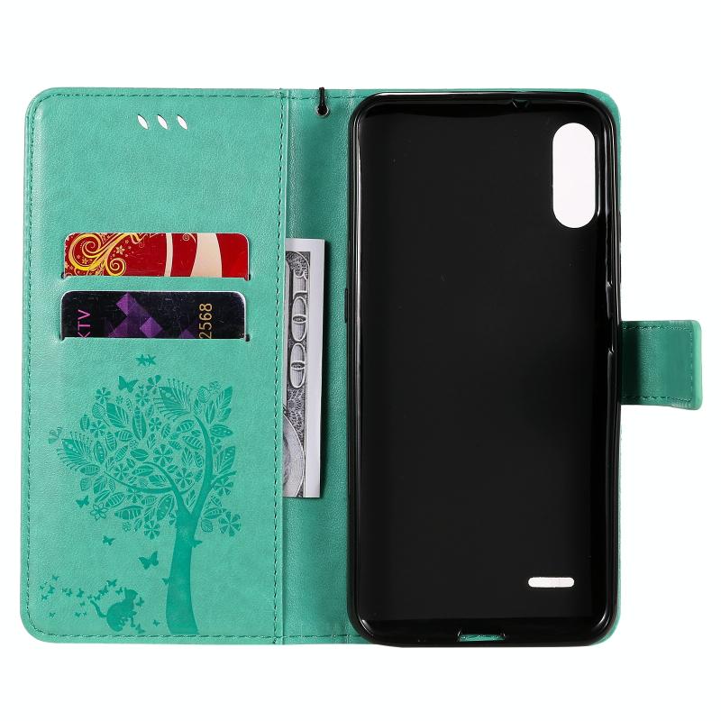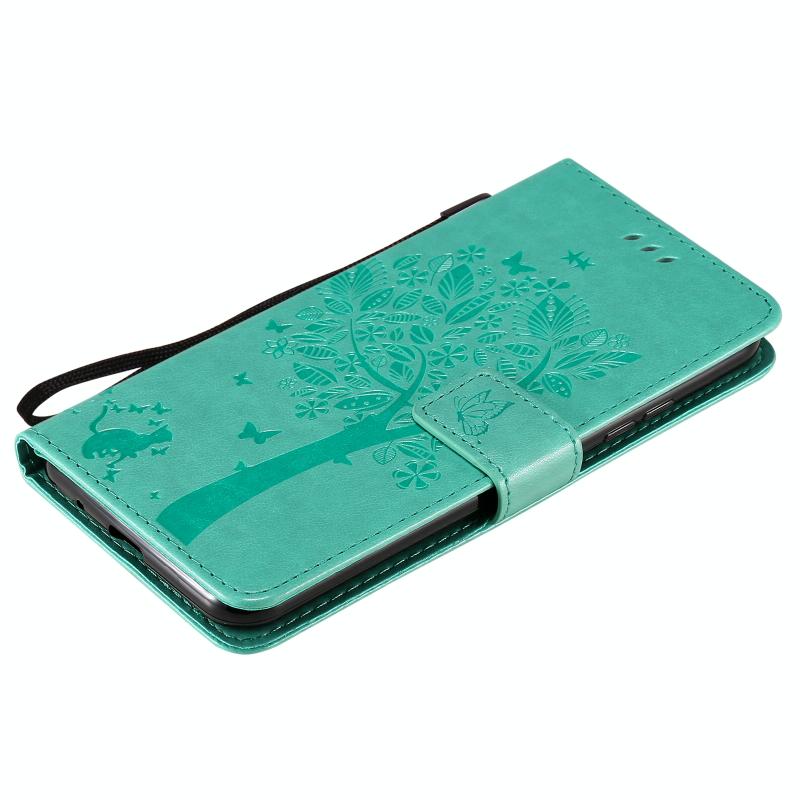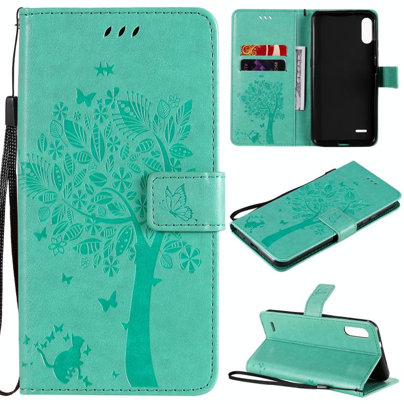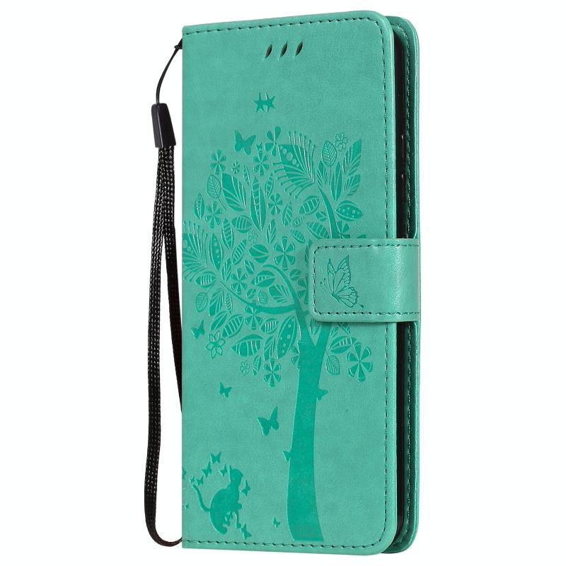 Θήκη για LG K22 / K22 Plus με σχέδιο Δέντρου & Γάτας, εκτυπωμένη με θερμοτύπηση, οριζόντια, από δερματίνη PU με βάση στήριξης, θήκες για κάρτες, πορτοφόλι & κορδόνι (πράσινο)