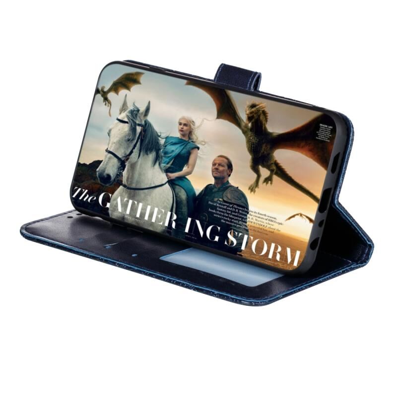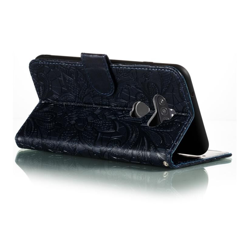 Θήκη δέρματος οριζόντιας αναδίπλωσης για LG K31 με σχέδιο δαντέλας και ανάγλυφο λουλουδιού, με βάση & υποδοχές καρτών & πορτοφόλι & κορνίζα φωτογραφιών & κορδόνι (Σκούρο Μπλε)