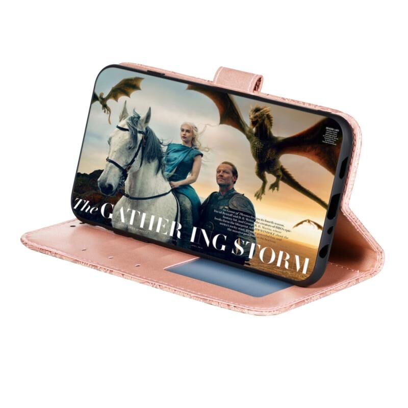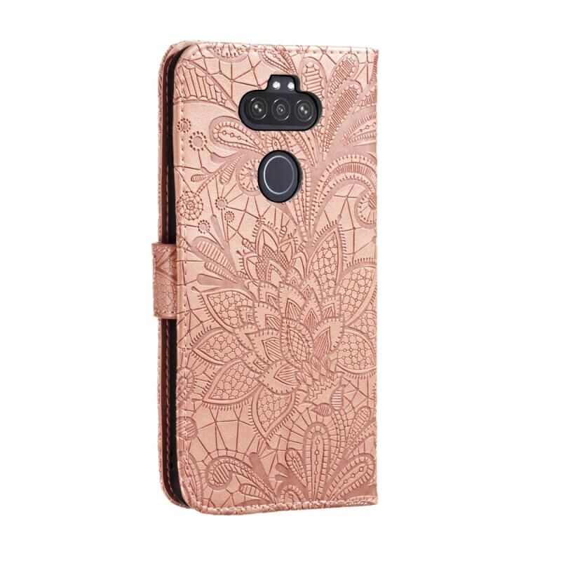 Θήκη για LG K31 με δαντελένιο λουλουδάτο ανάγλυφο σχέδιο, οριζόντια, από δέρμα, με βάση, θήκες για κάρτες, πορτοφόλι, κορνίζα φωτογραφιών & κορδόνι (Χρυσό Ρόδι)