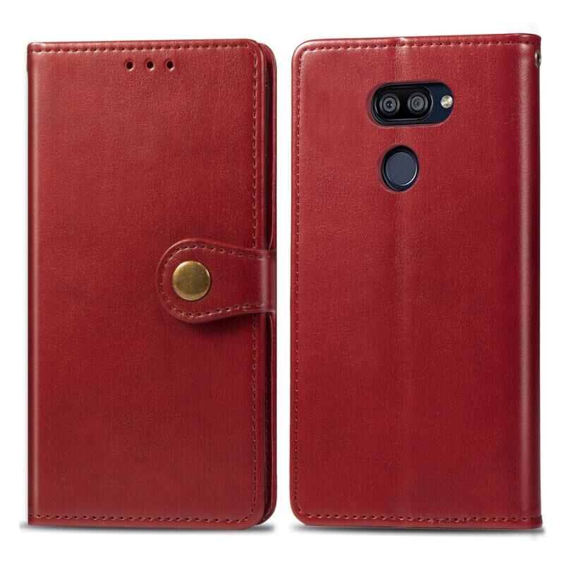 Για LG K40S Ρετρό στερεό χρώμα δερμάτινη θήκη τηλεφώνου πόρπη με κορδόνι & πλαίσιο φωτογραφιών & υποδοχή κάρτας & πορτοφόλι & λειτουργία Stand (κόκκινο)