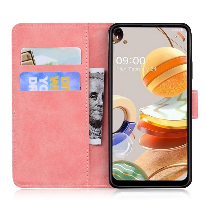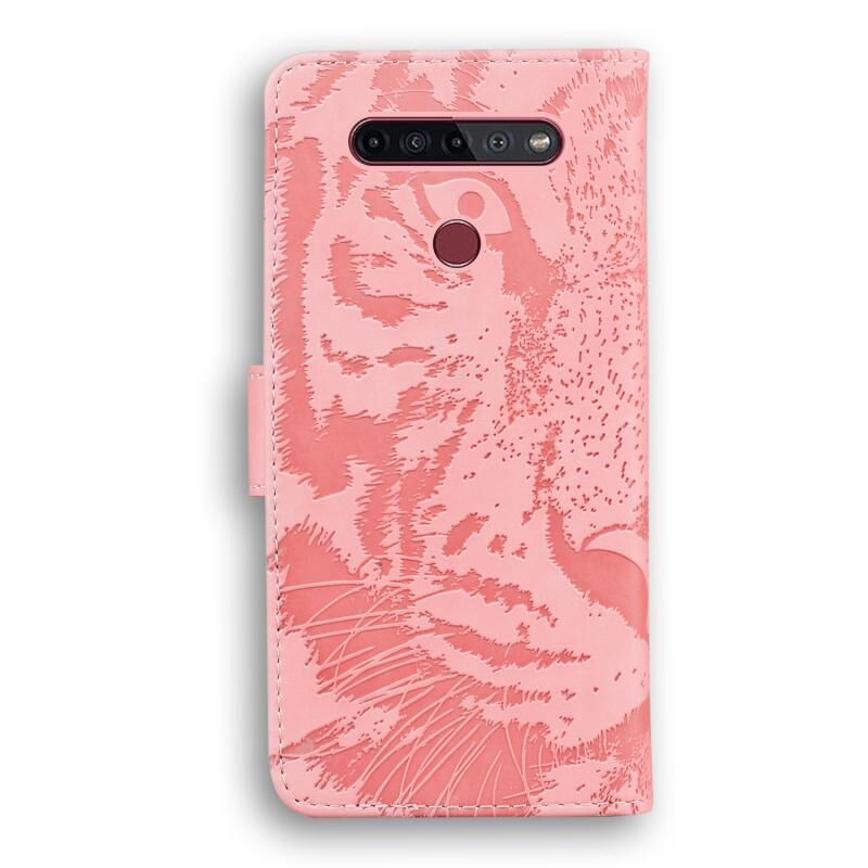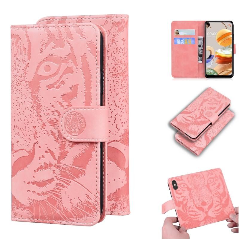 Θήκη δέρματος οριζόντιας αναδίπλωσης με ανάγλυφο σχέδιο τίγρης για LG K41S / K51S με βάση & υποδοχές καρτών & πορτοφόλι (Καφέ)