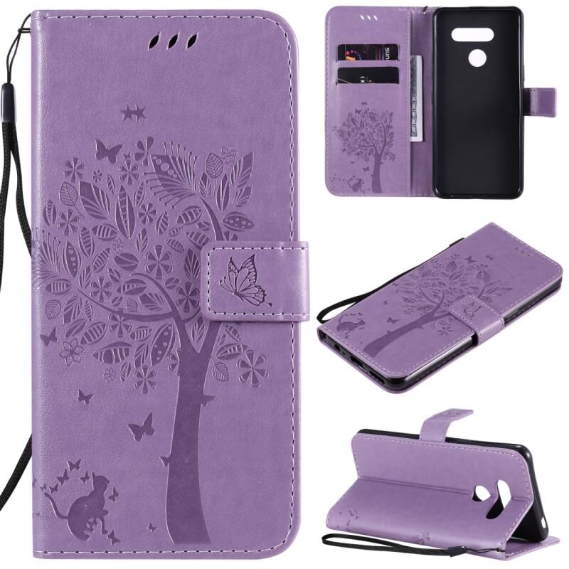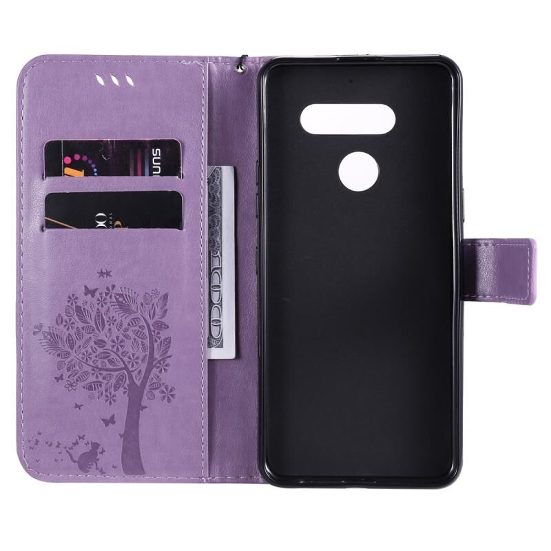 Θήκη δέρματος οριζόντιας αναδίπλωσης με ανάγλυφο σχέδιο δέντρου & γάτας για LG K41S / K51S με βάση στήριξης & θήκες καρτών & πορτοφόλι & κορδόνι (Πράσινο)