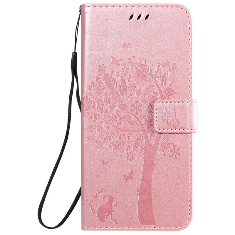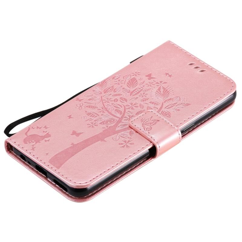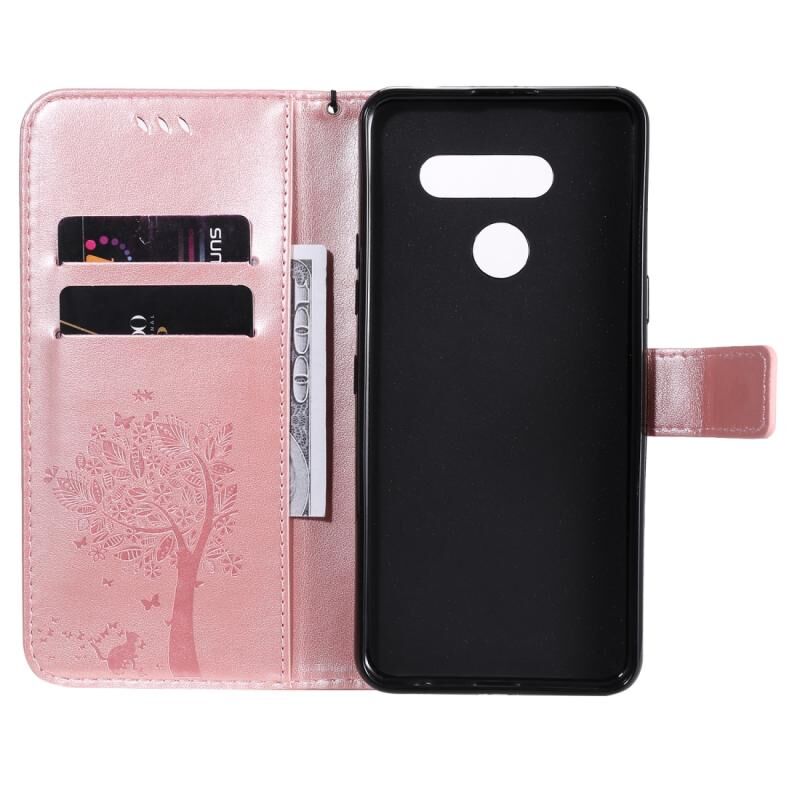 Θήκη δέρματος οριζόντιας αναδίπλωσης με ανάγλυφο σχέδιο δέντρου & γάτας για LG K41S / K51S με βάση στήριξης & θήκες καρτών & πορτοφόλι & κορδόνι (Πράσινο)