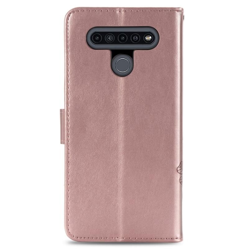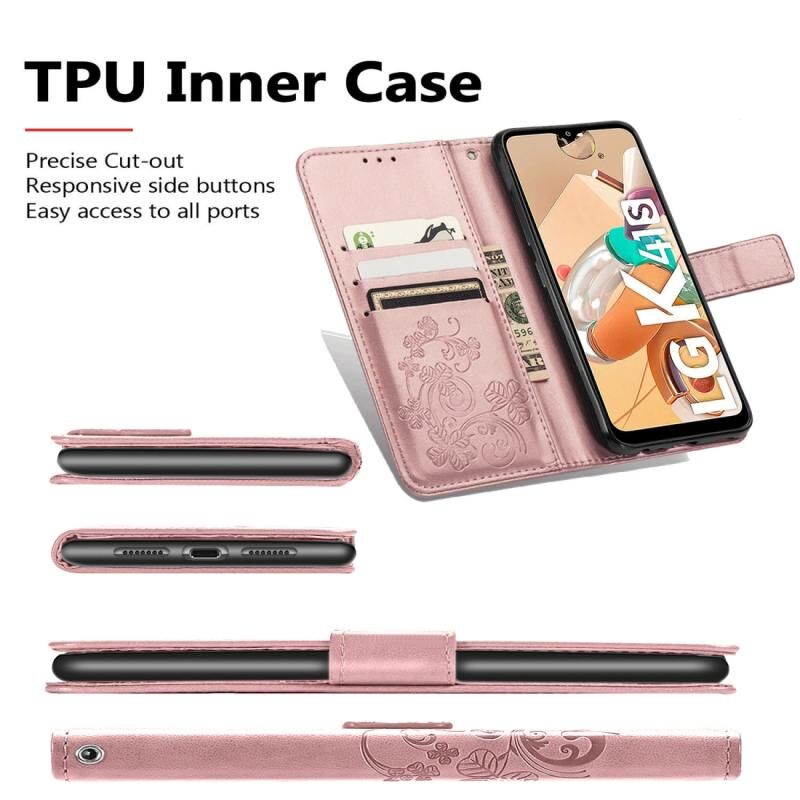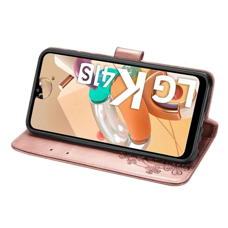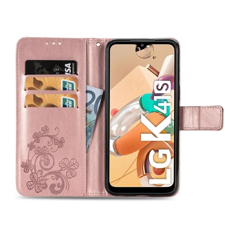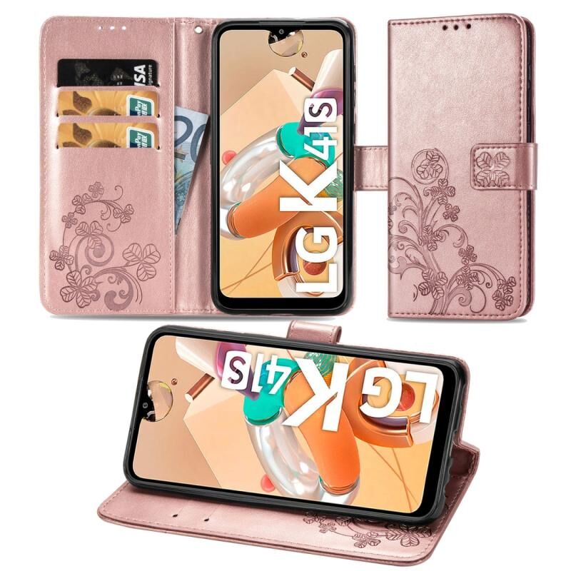 Θήκη δερμάτινη για LG K41S Lucky Clover με σχέδιο πιεσμένων λουλουδιών, με βάση στήριξης, θήκες για κάρτες, πορτοφόλι και λουρί χειρός (Χρυσό Ρόδι)