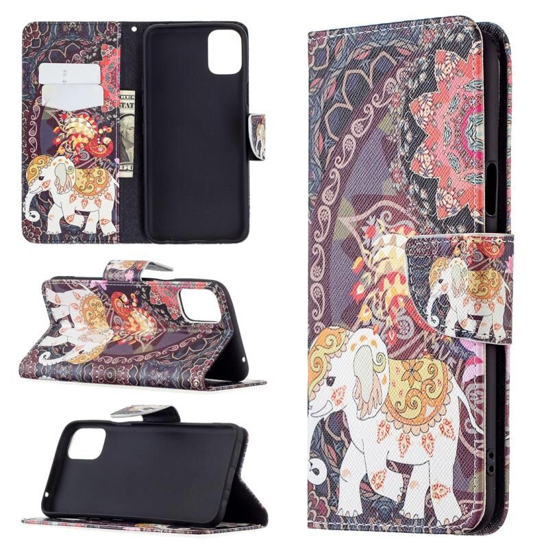 Θήκη δέρματος οριζόντιας αναδίπλωσης με σχέδιο πολύχρωμης ζωγραφικής για LG K42 με βάση & υποδοχές καρτών & πορτοφόλι (Λουλούδια Ελέφαντας)