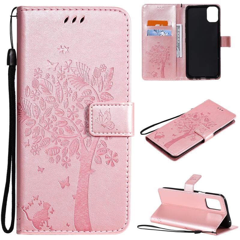 For LG K42 Tree & Cat Pattern Pressed Printing Horizontal Flip PU Leather Case with Holder & Card Slots & Wallet & Lanyard(Rose Gold)
