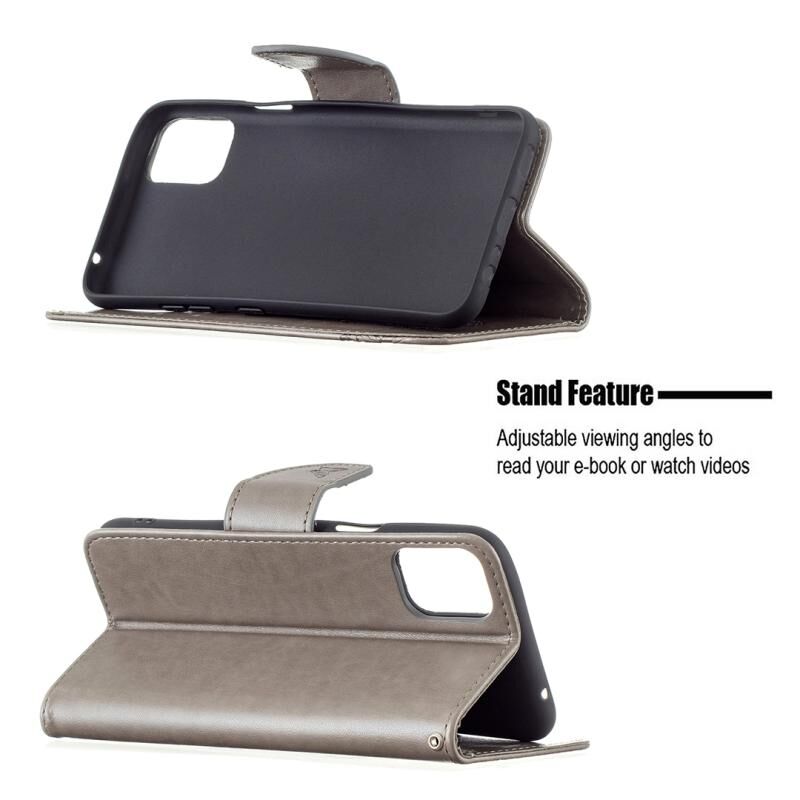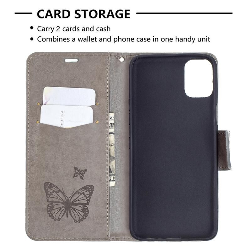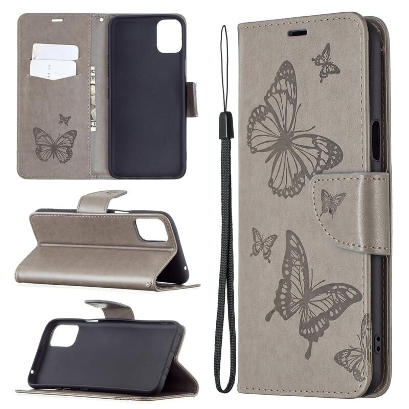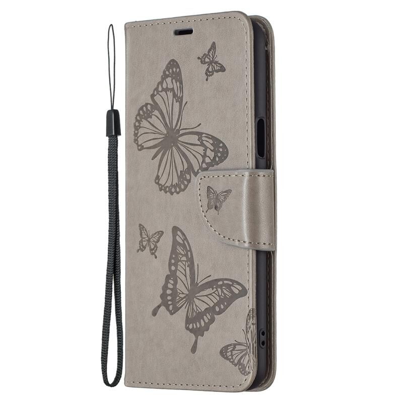 Για LG K42 Δύο πεταλούδες ανάγλυφο μοτίβο οριζόντια Flip δερμάτινη θήκη με κάτοχο & υποδοχή για κάρτες & πορτοφόλι & κορδόνι (γκρι)