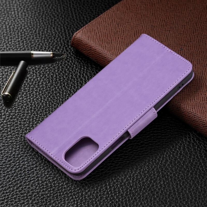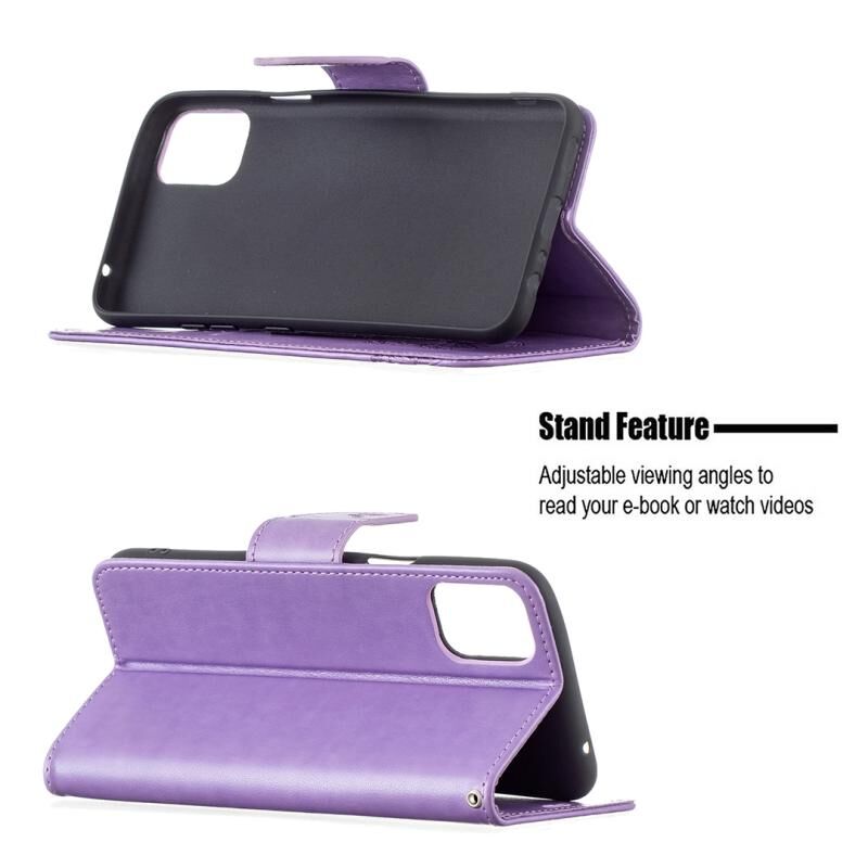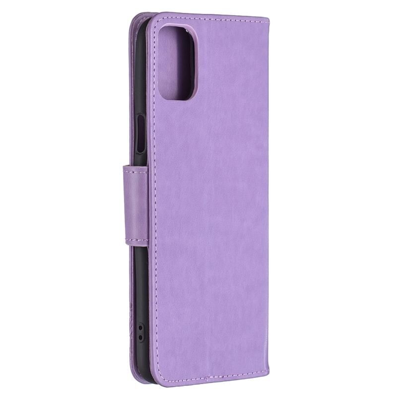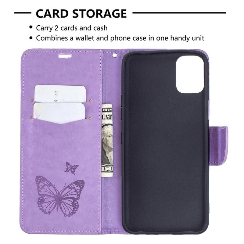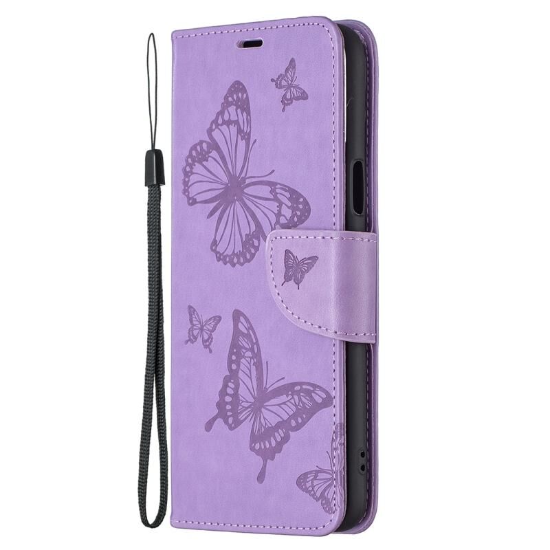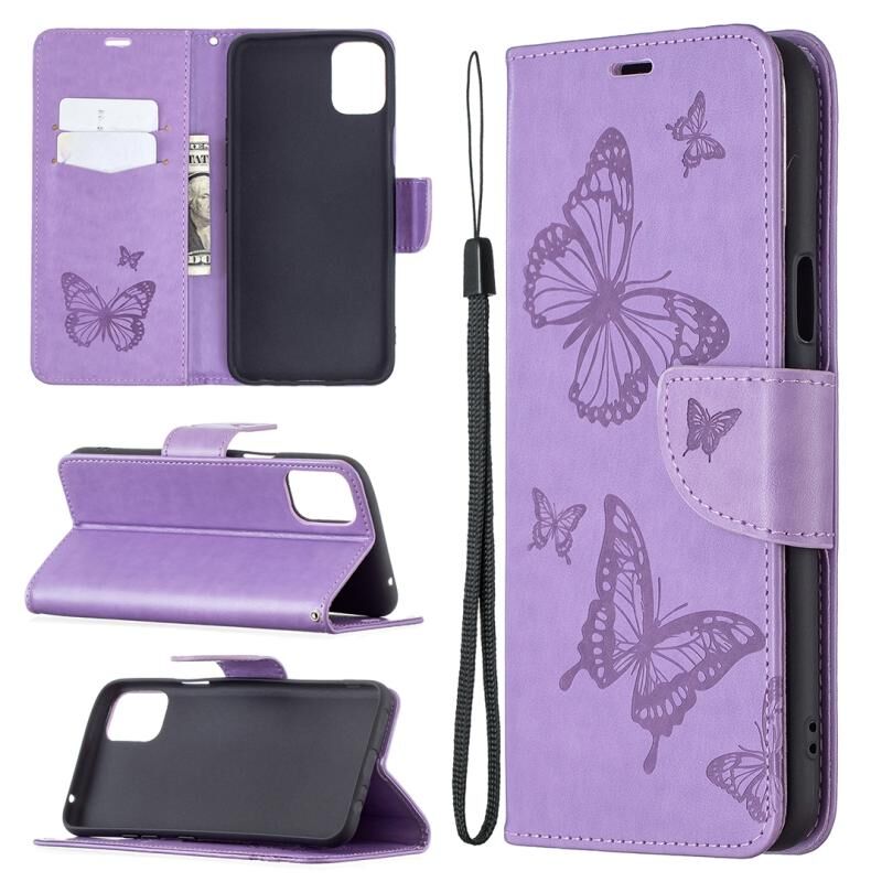 Για LG K42 Δύο πεταλούδες ανάγλυφο μοτίβο οριζόντια Flip δερμάτινη θήκη με κάτοχο & υποδοχή για κάρτες & πορτοφόλι & κορδόνι (μωβ)