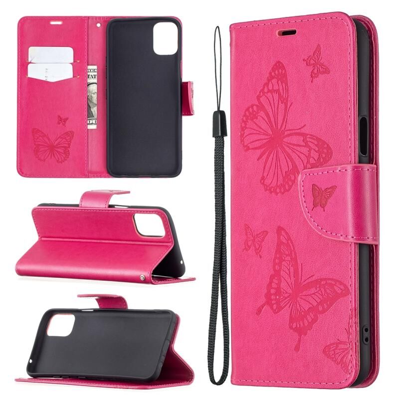 Για LG K42 Δύο πεταλούδες ανάγλυφο μοτίβο οριζόντια Flip δερμάτινη θήκη με κάτοχο & υποδοχή για κάρτες & πορτοφόλι & κορδόνι (Rose Red)