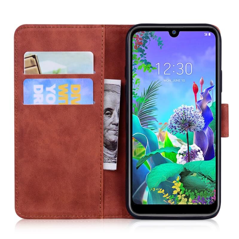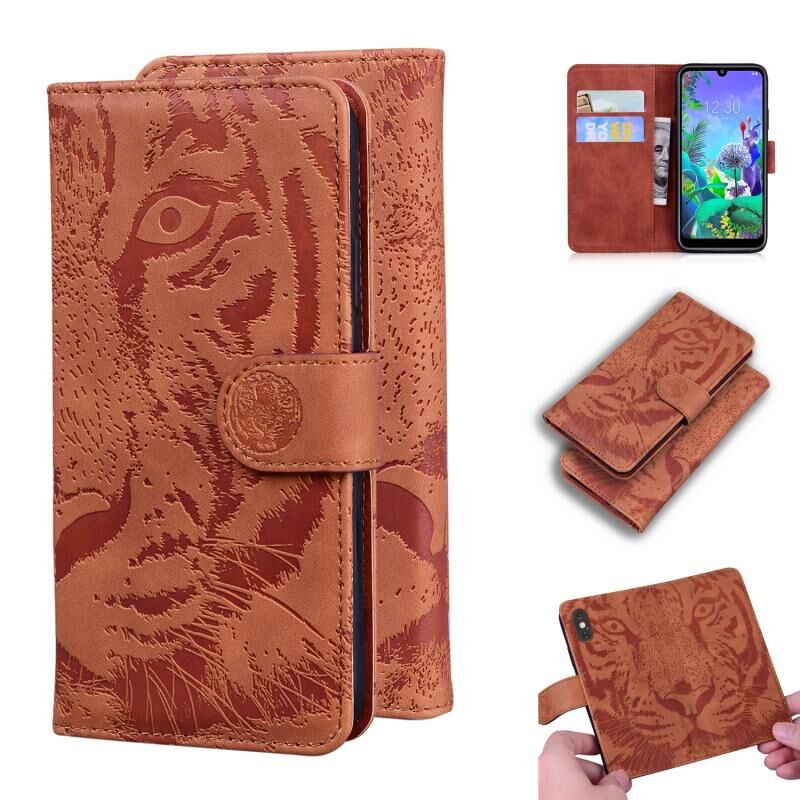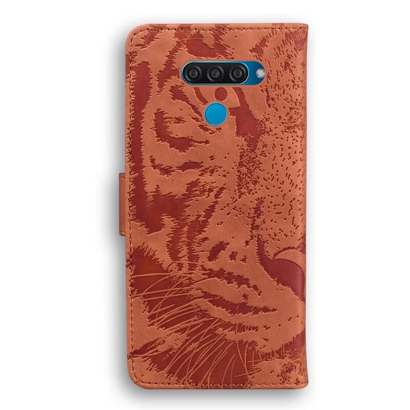 Θήκη δέρματος οριζόντιας αναδίπλωσης με ανάγλυφο σχέδιο τίγρης για LG K50 / Q60 με βάση & υποδοχές καρτών & πορτοφόλι (Κόκκινο)