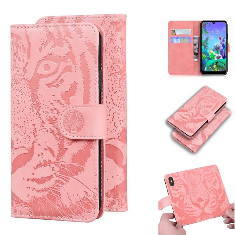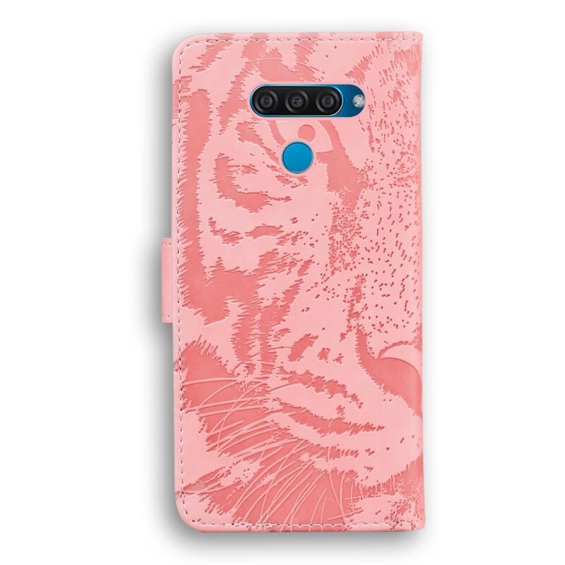Θήκη δέρματος οριζόντιας αναδίπλωσης με ανάγλυφο σχέδιο τίγρης για LG K50 / Q60 με βάση & υποδοχές καρτών & πορτοφόλι (Κόκκινο)