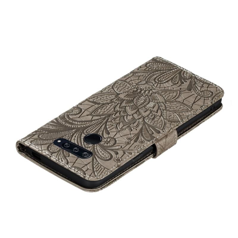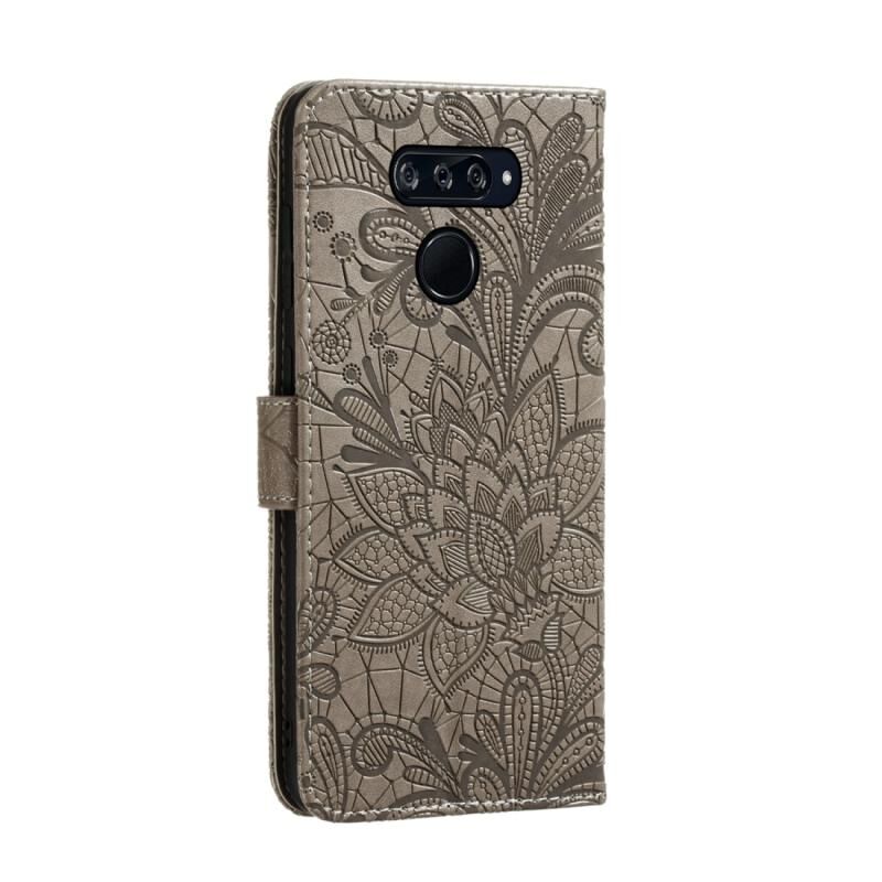 Θήκη για LG K50S με δαντελένιο λουλουδάτο ανάγλυφο σχέδιο, οριζόντια, από δέρμα με βάση στήριξης, θήκες για κάρτες, πορτοφόλι, κορνίζα φωτογραφιών & λουρί (Σκούρο Μπλε)
