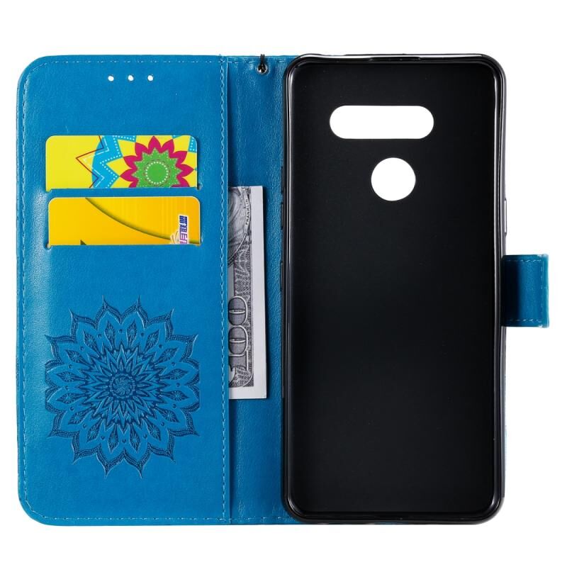 Για LG K50S Πιεσμένη εκτύπωση ηλιοτρόπιο μοτίβο οριζόντια Flip PU δέρμα θήκη κάτοχος & υποδοχές για κάρτες & πορτοφόλι & κορδόνι (μπλε)