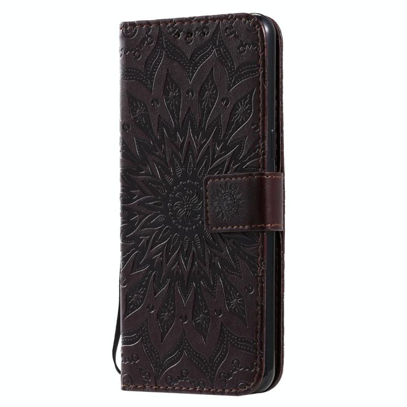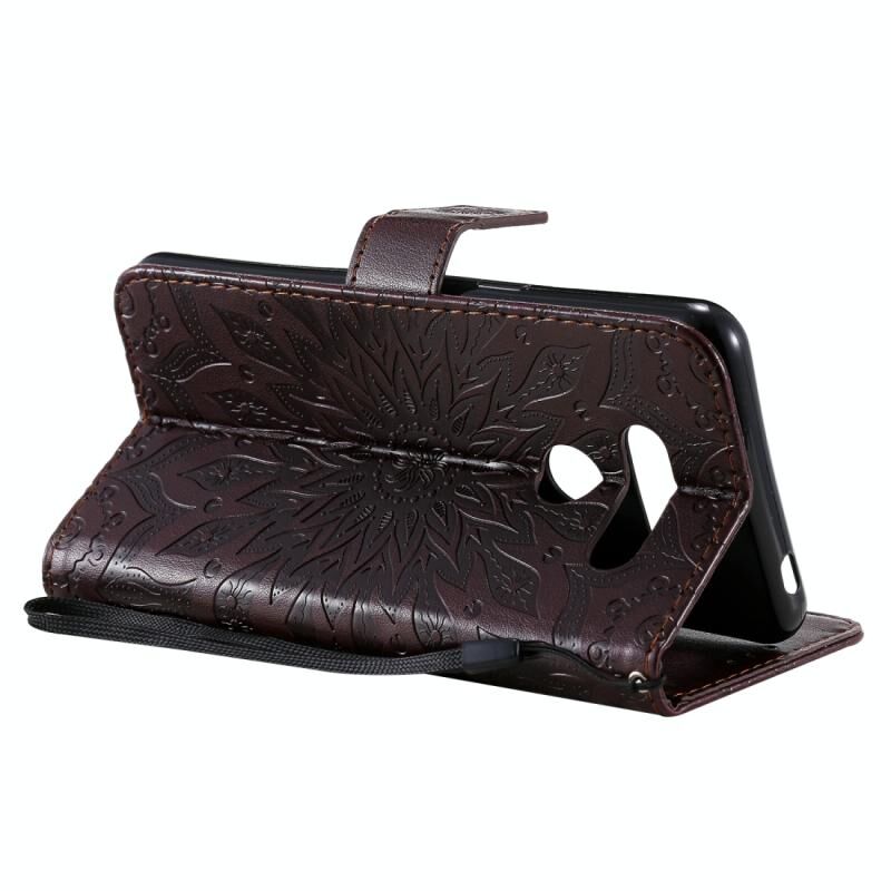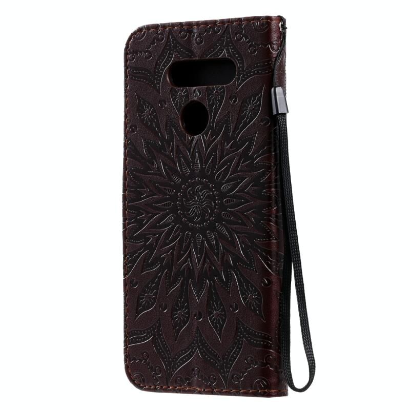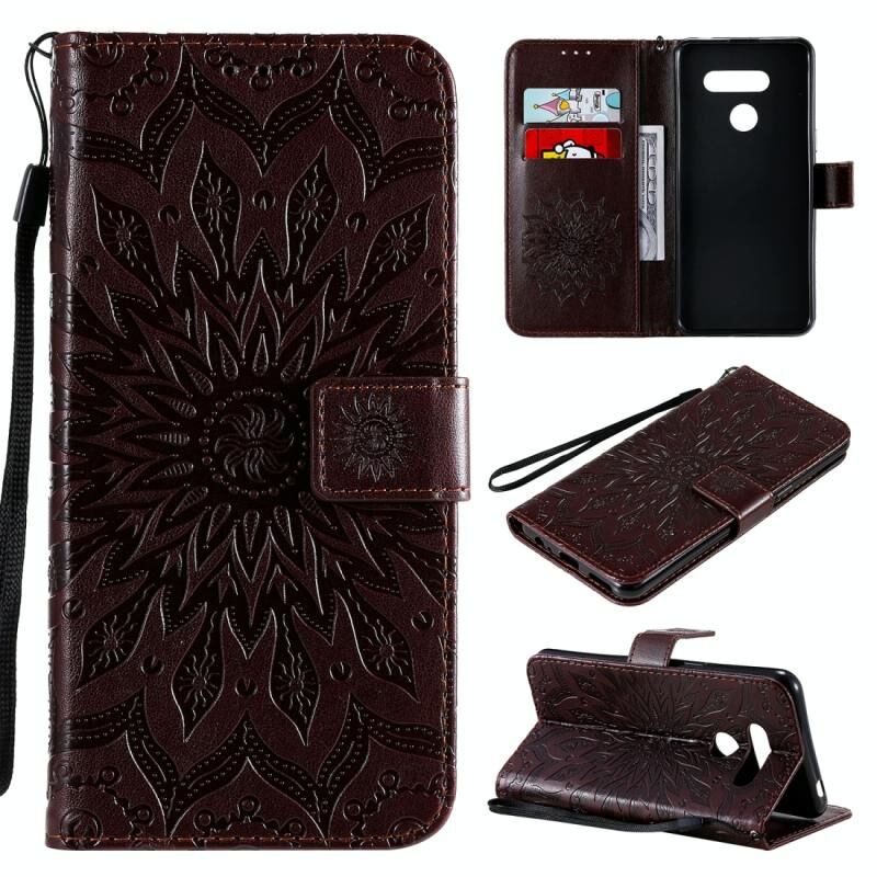 Για LG K50S Πιεσμένη εκτύπωση ηλιοτρόπιο μοτίβο οριζόντια Flip PU δέρμα θήκη κάτοχος & υποδοχές για κάρτες & πορτοφόλι & κορδόνι (καφέ)