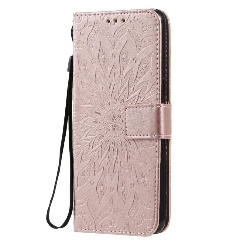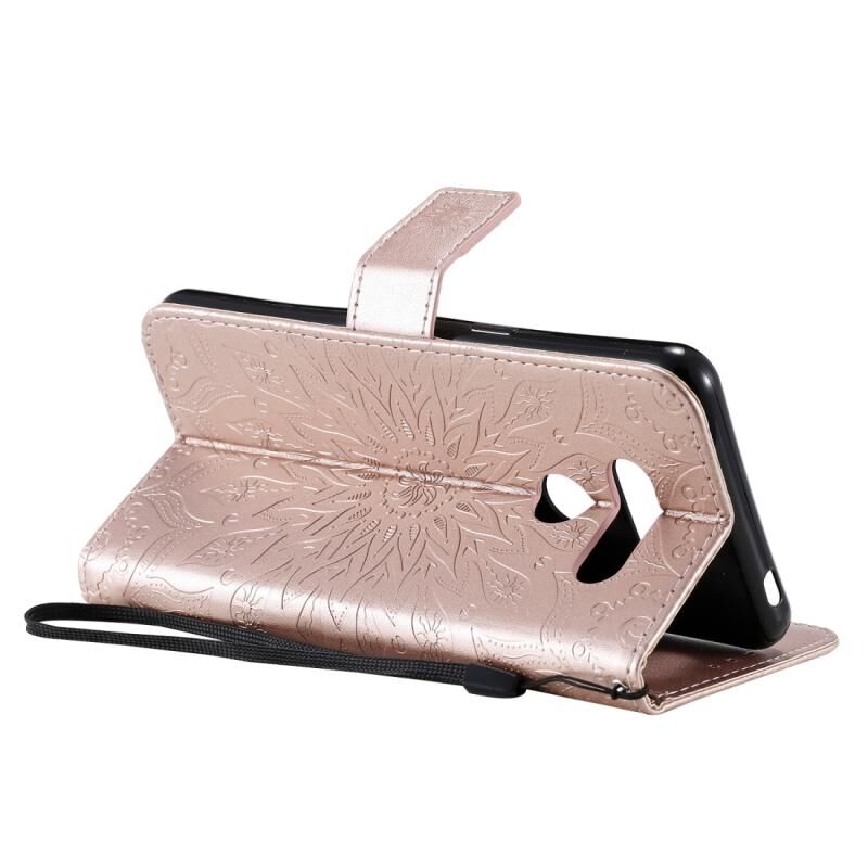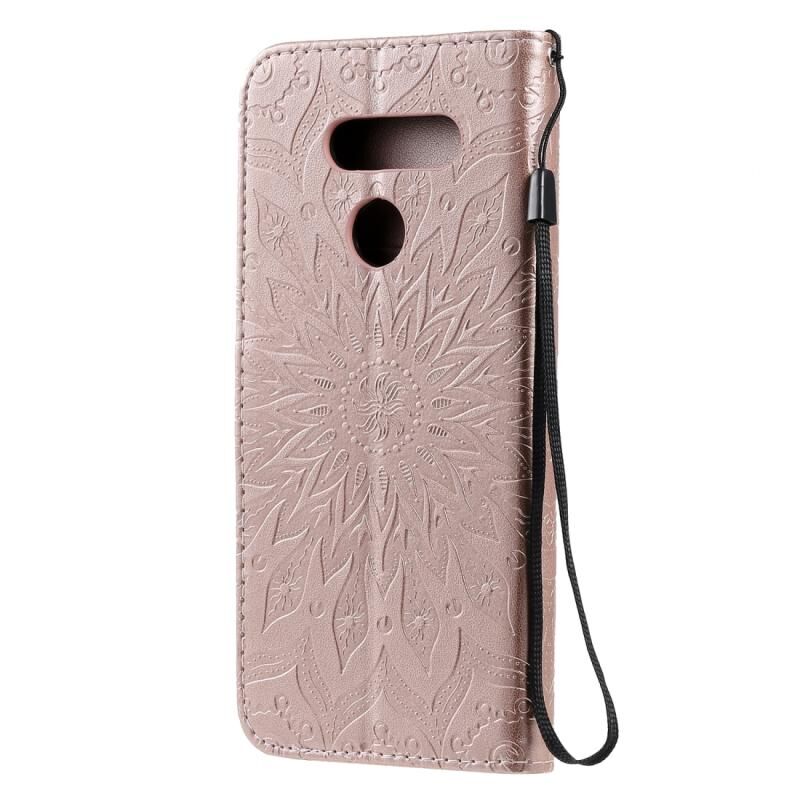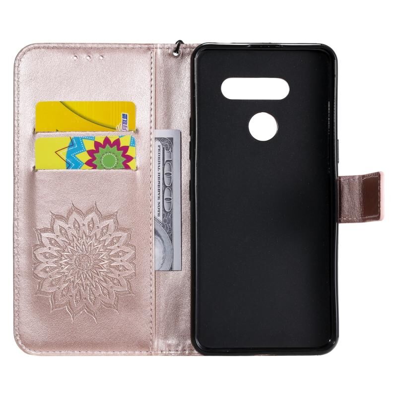 Για LG K50S Πιεσμένη εκτύπωση ηλιοτρόπιο μοτίβο οριζόντια Flip PU δέρμα θήκη κάτοχος & υποδοχές για κάρτες & πορτοφόλι & Lanyard (Rose Gold)