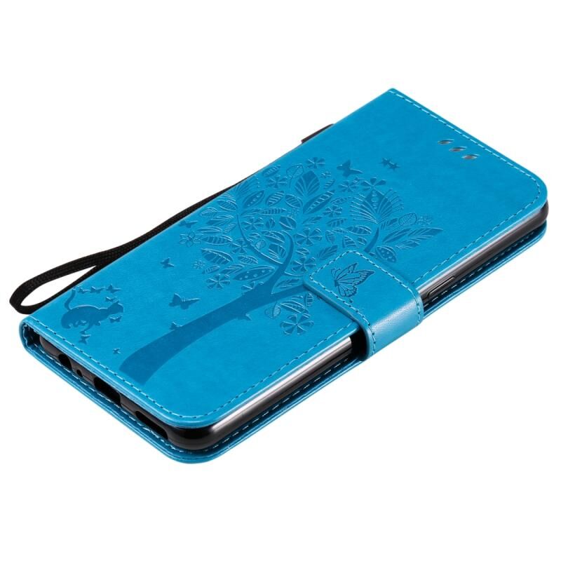 Θήκη δέρματος οριζόντιας αναδίπλωσης για LG K50S με ανάγλυφο σχέδιο Δέντρου & Γάτας, με βάση στήριξης & θήκες καρτών & πορτοφόλι & κορδόνι (Πράσινο)