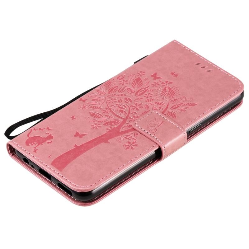 Θήκη δέρματος οριζόντιας αναδίπλωσης για LG K50S με ανάγλυφο σχέδιο Δέντρου & Γάτας, με βάση στήριξης & θήκες καρτών & πορτοφόλι & κορδόνι (Πράσινο)