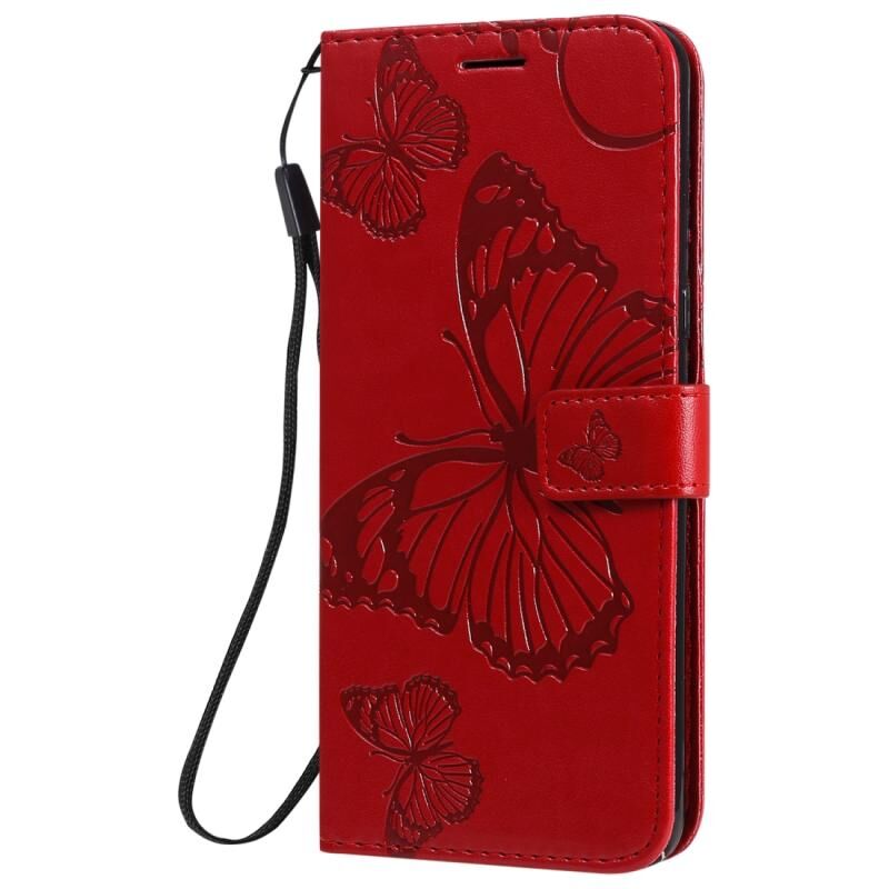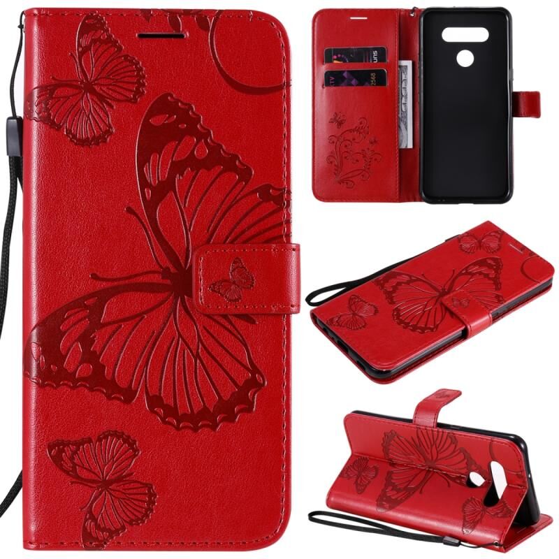 Θήκη δέρματος οριζόντιας αναδίπλωσης για LG K51 με ανάγλυφο σχέδιο 3D πεταλούδας, με βάση, θήκη καρτών, πορτοφόλι και λουρί (Κόκκινο)