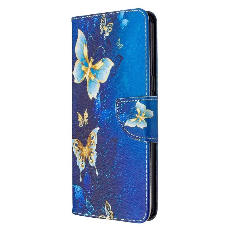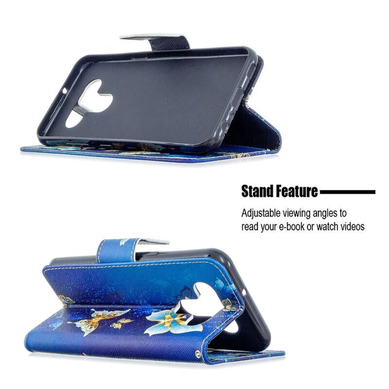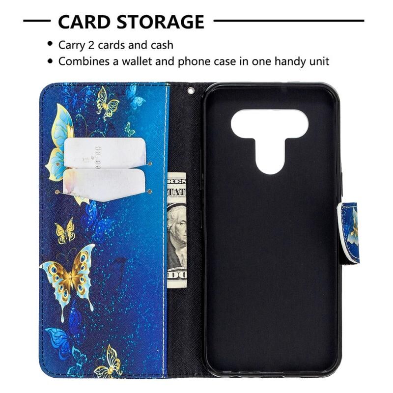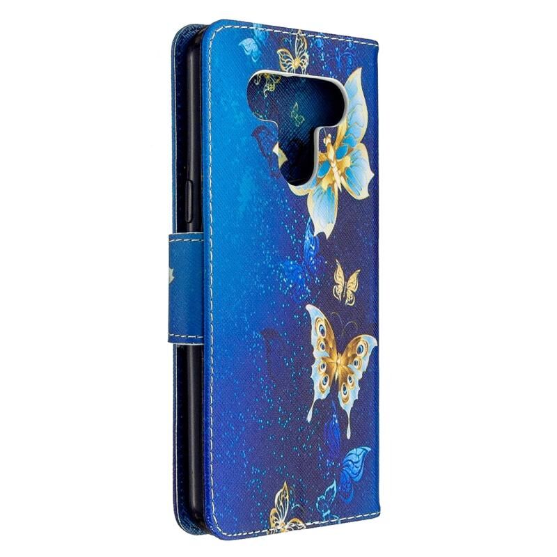 Θήκη δέρματος οριζόντιας αναδίπλωσης με σχέδιο πολύχρωμης ζωγραφικής για LG K51 με βάση & υποδοχές καρτών & πορτοφόλι (Μωβ Πεταλούδα)