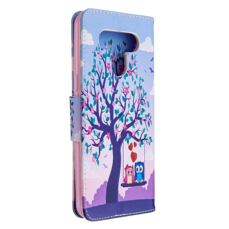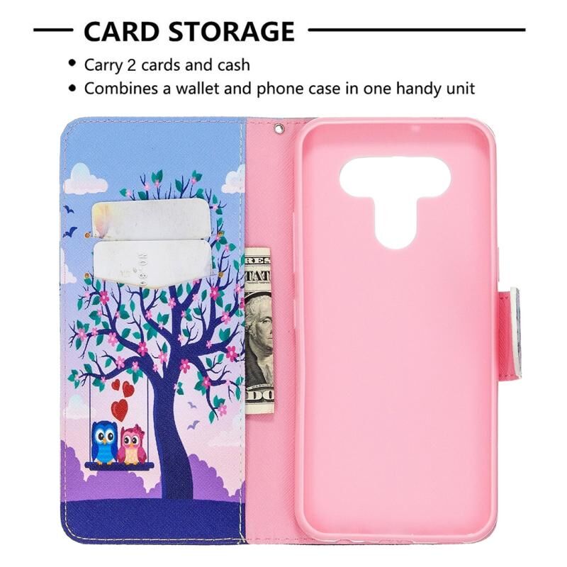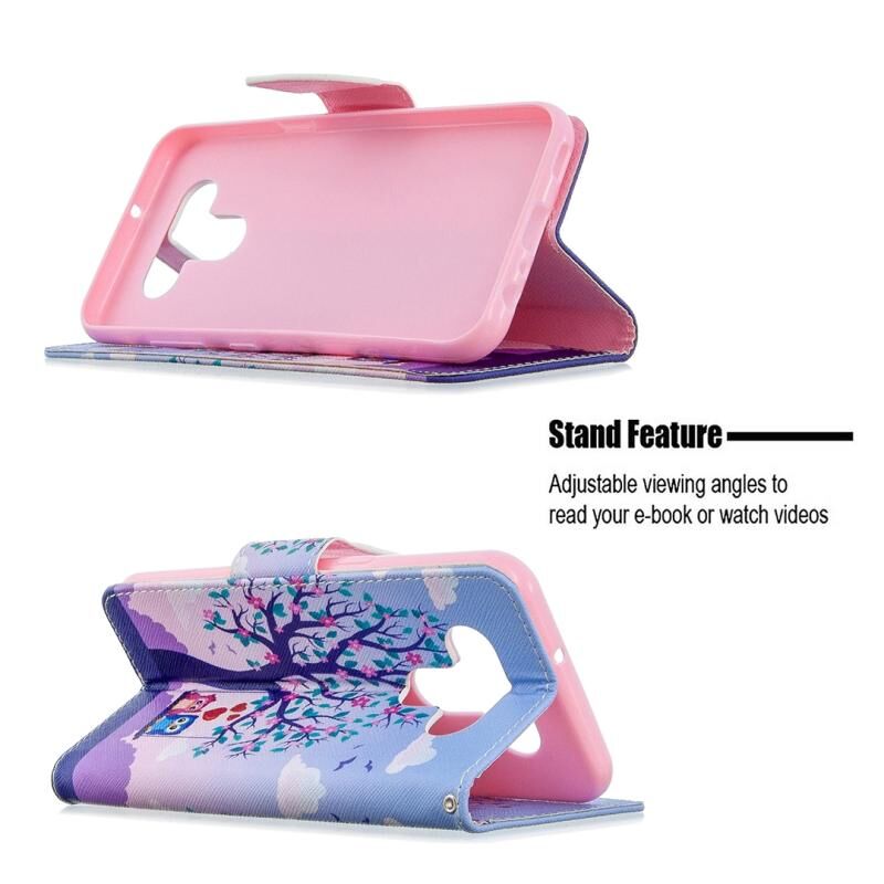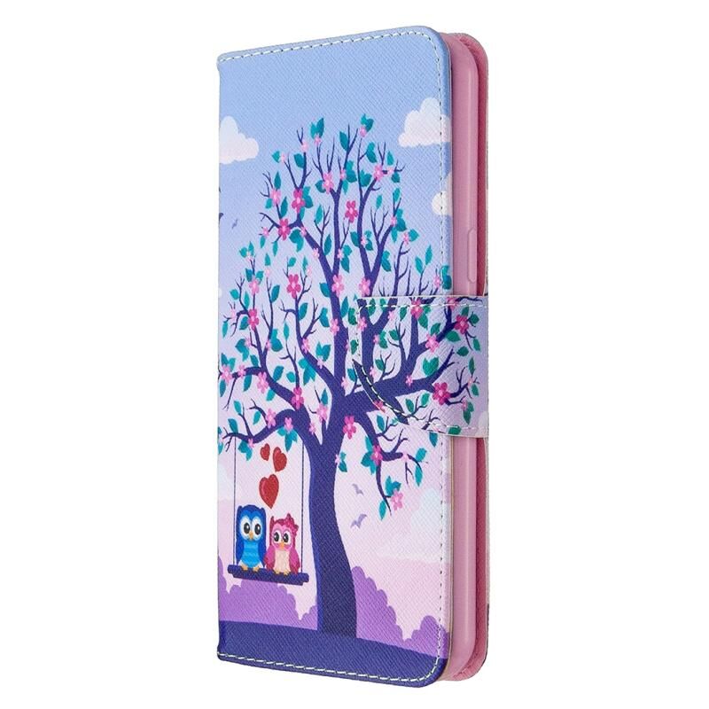 Θήκη δέρματος οριζόντιας αναδίπλωσης με σχέδιο πολύχρωμης ζωγραφικής για LG K51 με βάση & υποδοχές καρτών & πορτοφόλι (Δύο κουκουβάγιες)