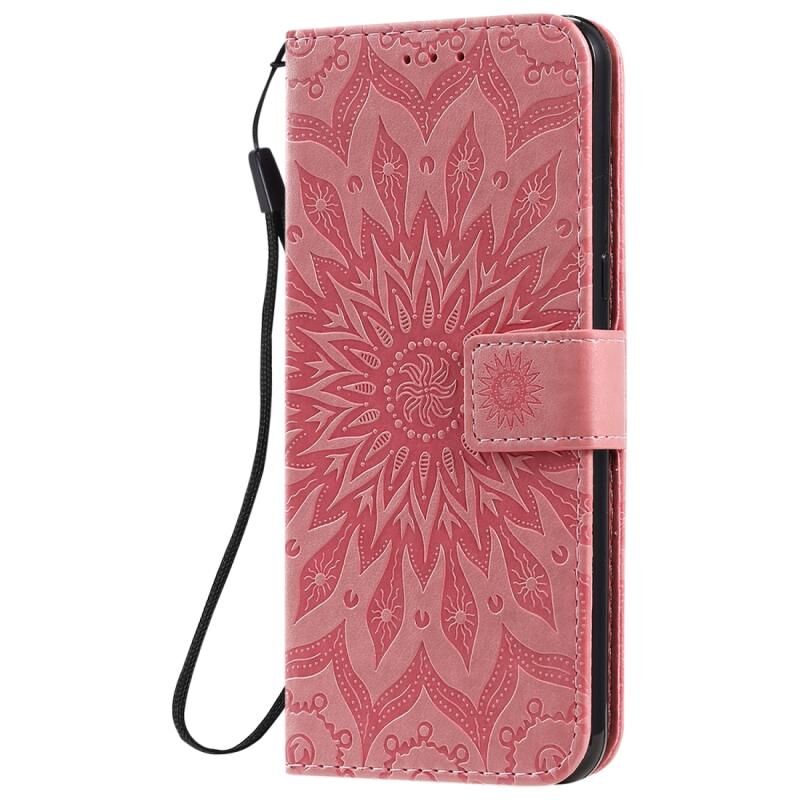 Για LG K51 Πιεσμένη εκτύπωση ηλιοτρόπιο μοτίβο οριζόντια Flip PU δέρμα θήκη κάτοχος & υποδοχές για κάρτες & πορτοφόλι & κορδόνι (ροζ)