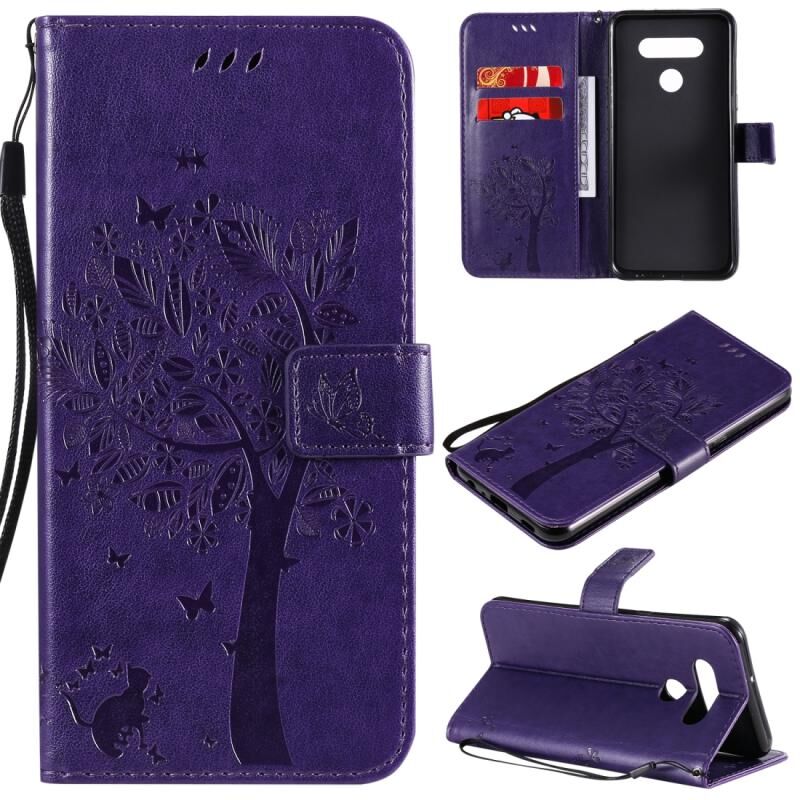 Θήκη για LG K51 με ανάγλυφο σχέδιο Δέντρου & Γάτας, οριζόντια, από δέρμα με βάση στήριξης, θήκες για κάρτες, πορτοφόλι & λουρί (Πράσινο)
