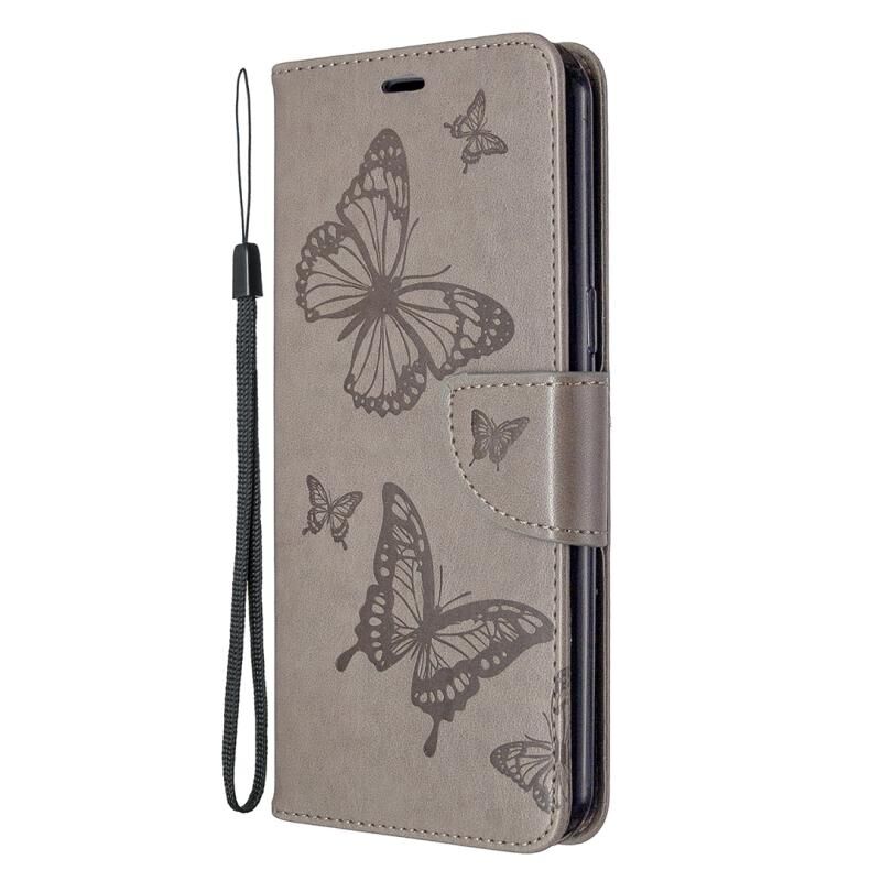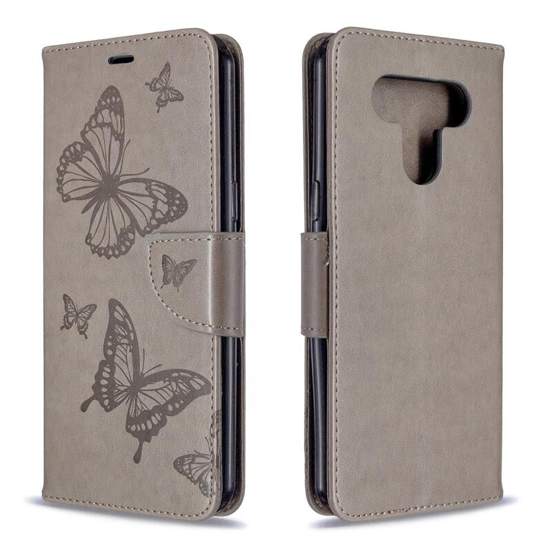 Για LG K51 Δύο πεταλούδες ανάγλυφο μοτίβο οριζόντια Flip δερμάτινη θήκη με κάτοχο & υποδοχή για κάρτες & πορτοφόλι & κορδόνι (γκρι)