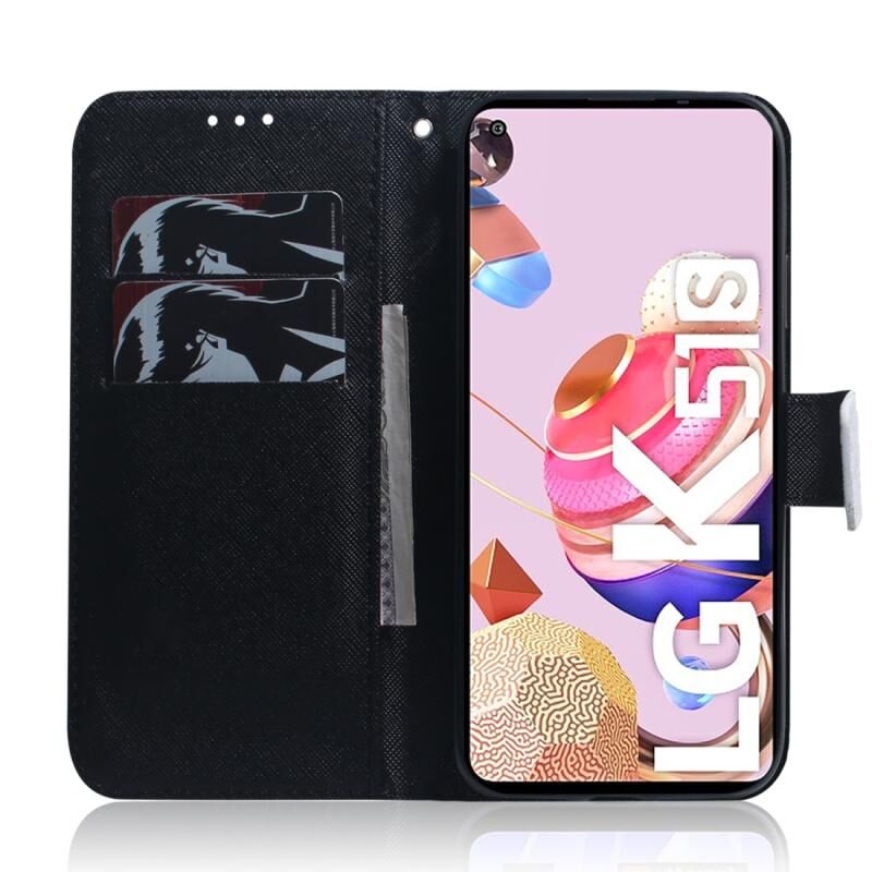 Θήκη δέρματος οριζόντιας αναδίπλωσης με σχέδιο για LG K51S (Λύκος και Σκύλος), με βάση, θήκες για κάρτες και πορτοφόλι.