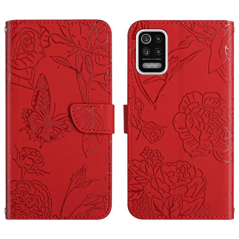 Θήκη τηλεφώνου από δέρμα με ανάγλυφο σχέδιο πεταλούδας και παιώνιας για LG K52 (Κόκκινο)