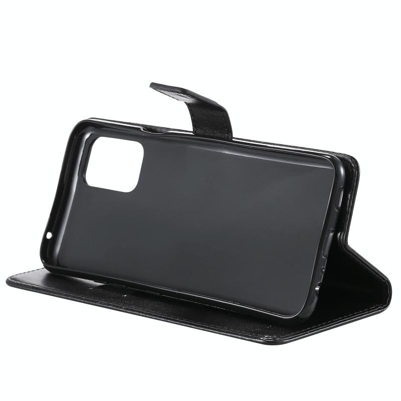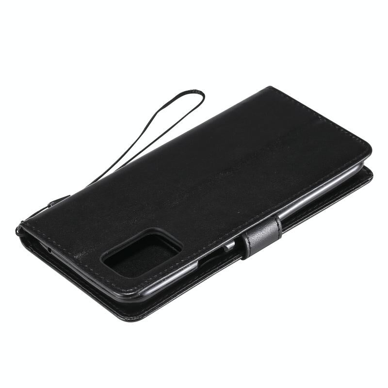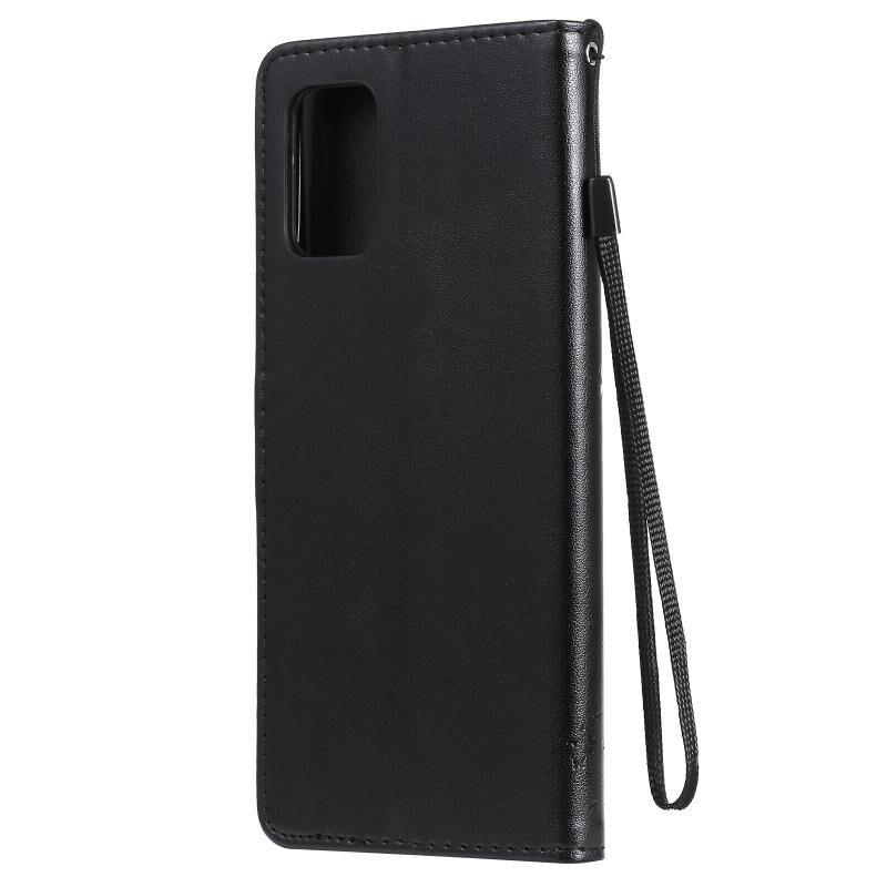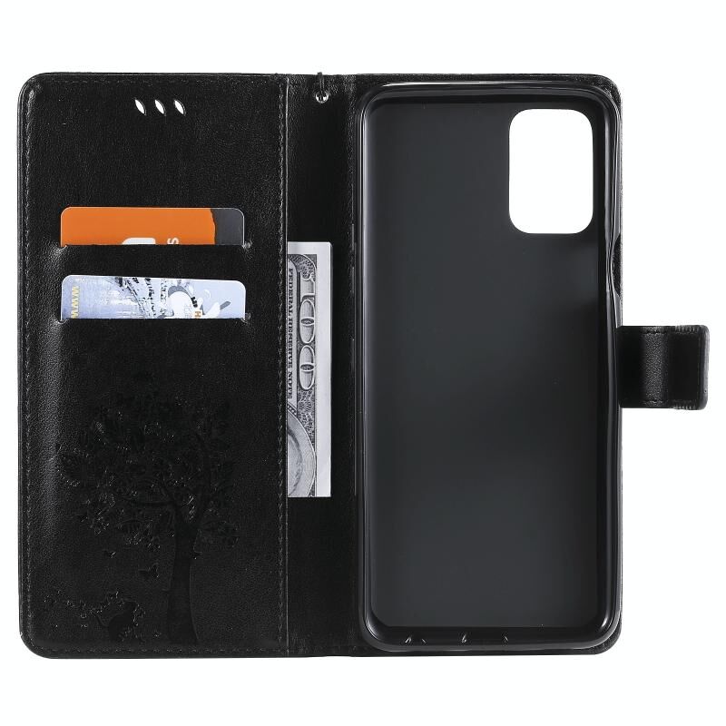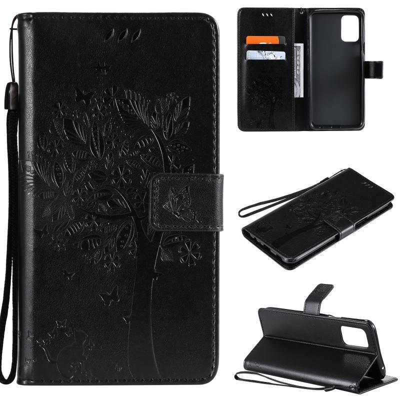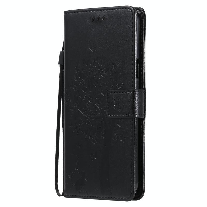 For LG K52 Tree & Cat Pattern Pressed Printing Horizontal Flip PU Leather Case with Holder & Card Slots & Wallet & Lanyard(Black)