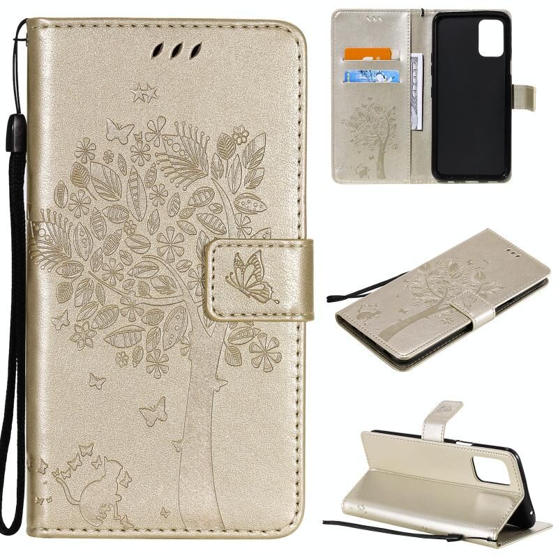 For LG K52 Tree & Cat Pattern Pressed Printing Horizontal Flip PU Leather Case with Holder & Card Slots & Wallet & Lanyard(Gold)