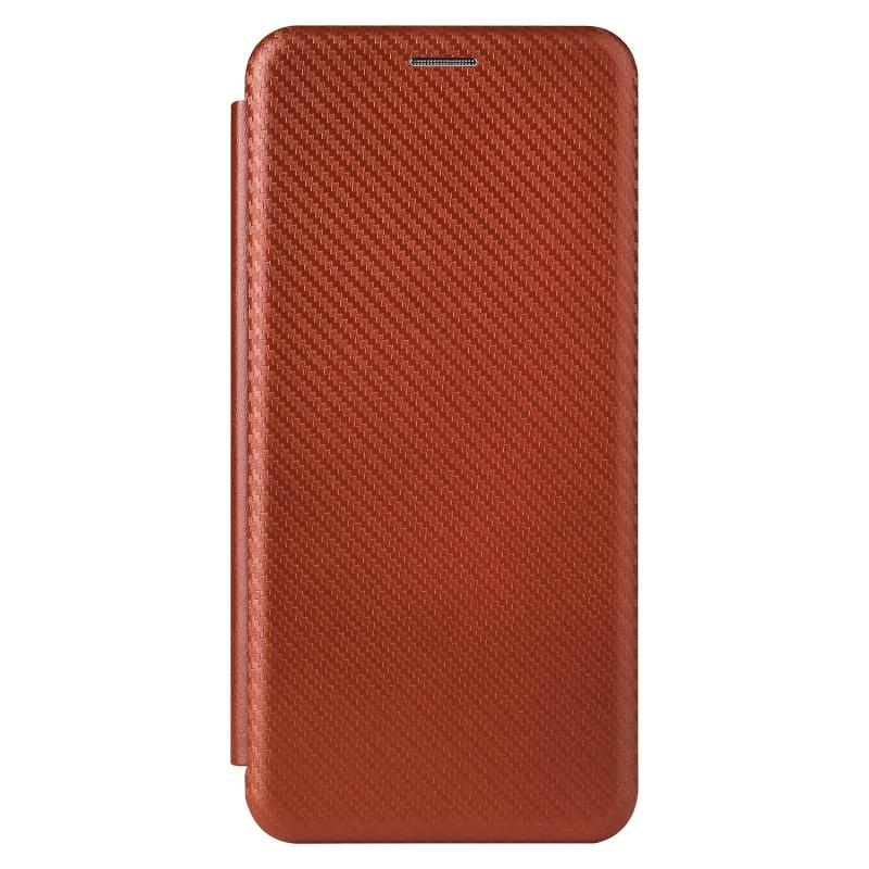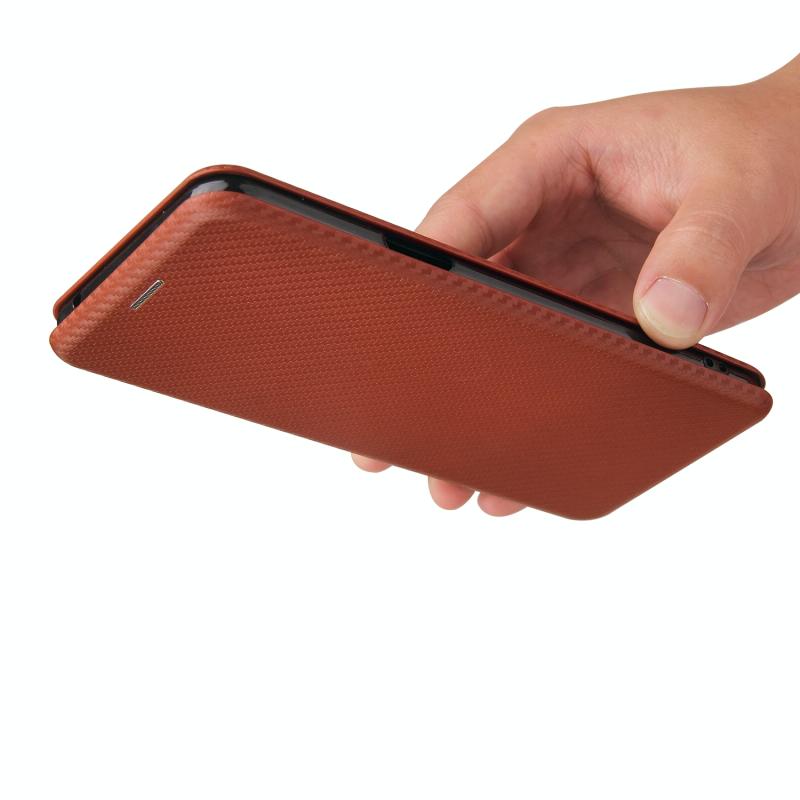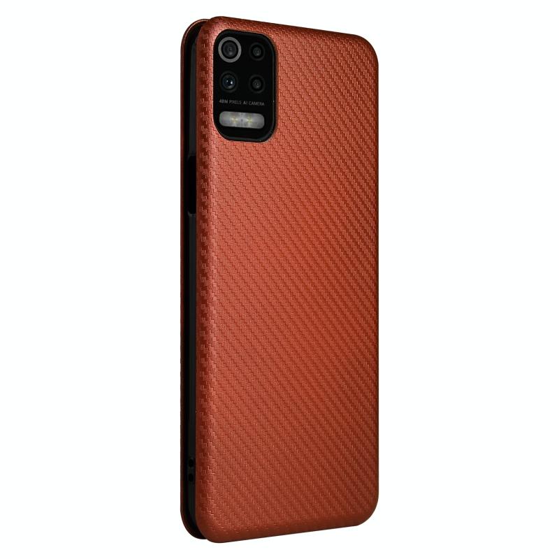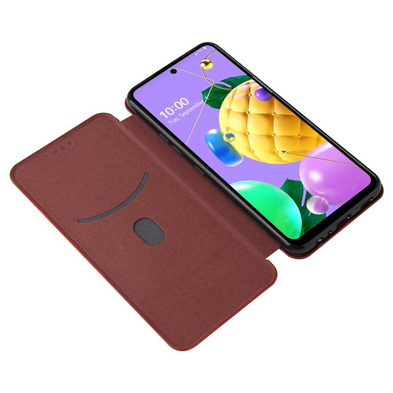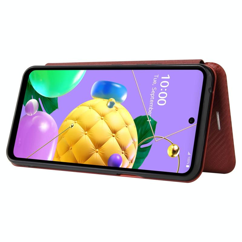Θήκη για LG K53 με υφή ανθρακονημάτων, οριζόντια, αναδιπλούμενη, από TPU + PC + Δερματίνη PU με θήκη για κάρτες (Καφέ)