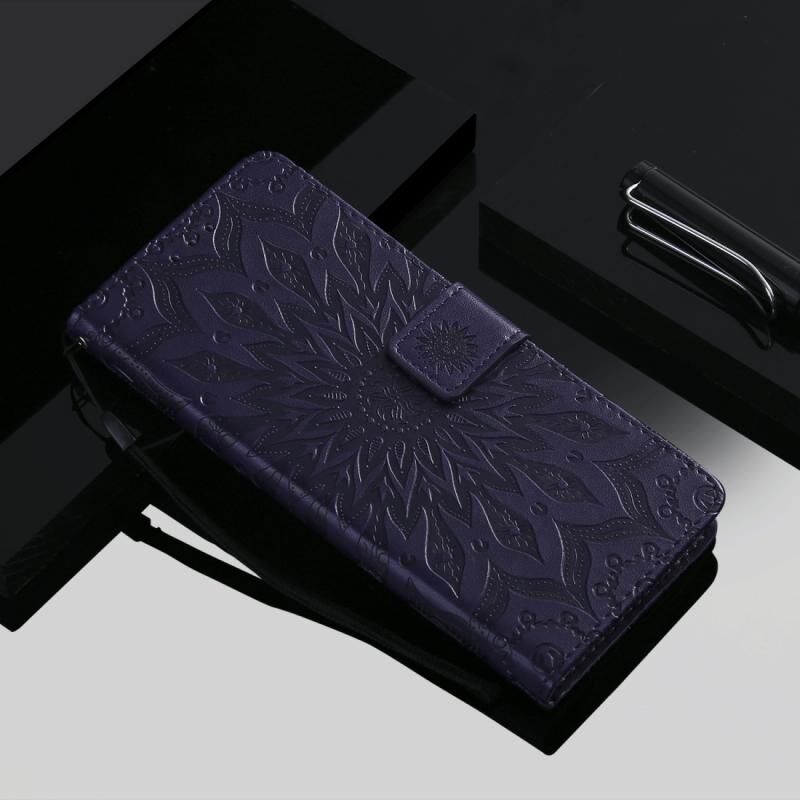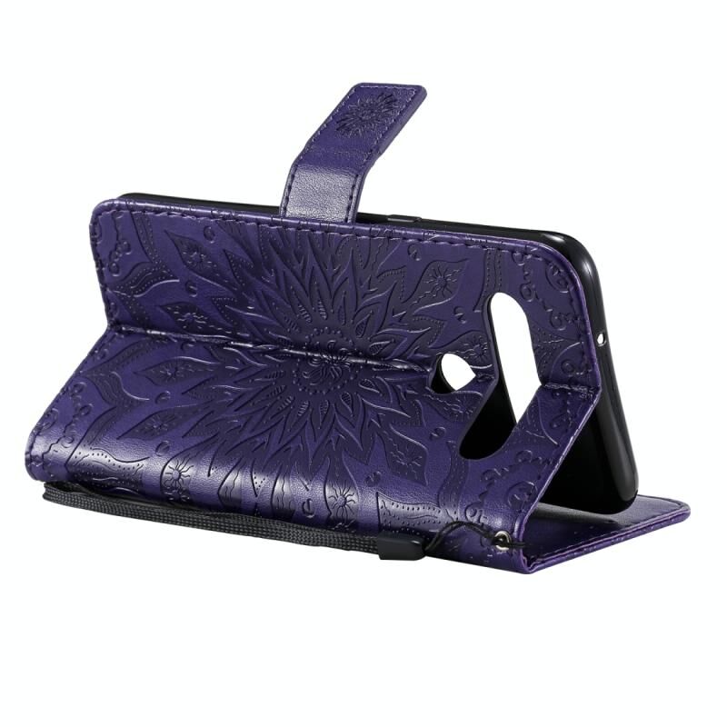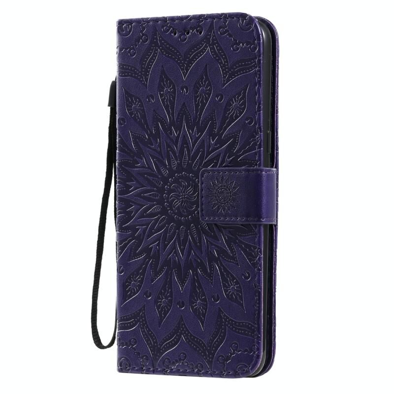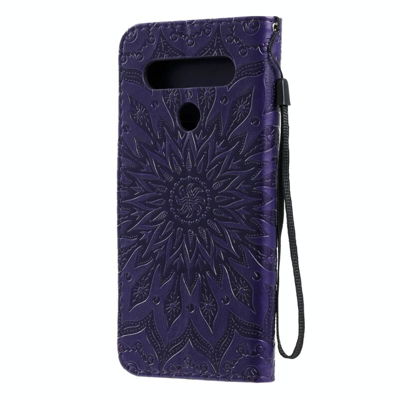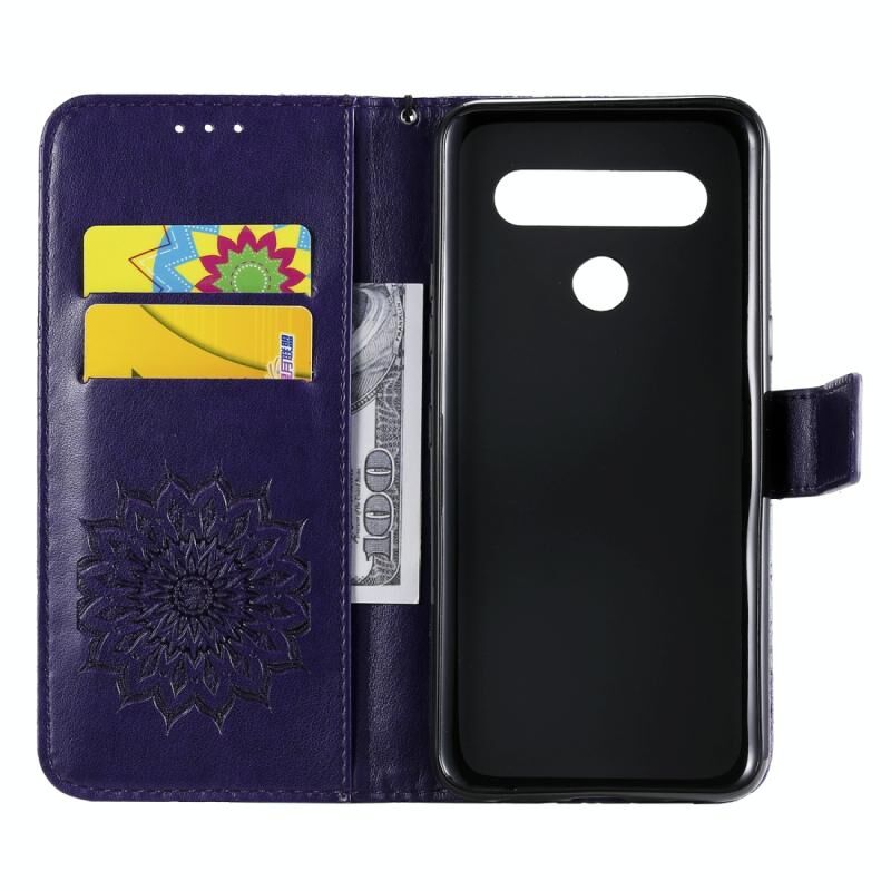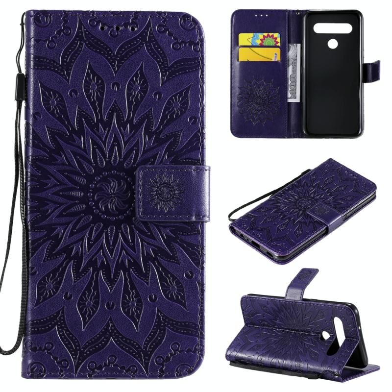Για LG K61 Πιεσμένη εκτύπωση ηλιοτρόπιο μοτίβο οριζόντια Flip PU δέρμα θήκη κάτοχος & υποδοχές για κάρτες & πορτοφόλι & κορδόνι (μωβ)
