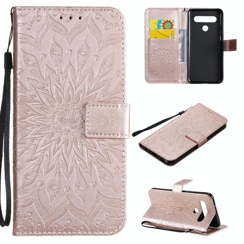 Για LG K61 Πιεσμένη εκτύπωση ηλιοτρόπιο μοτίβο οριζόντια Flip PU δέρμα θήκη κάτοχος & υποδοχές για κάρτες & πορτοφόλι & κορδόνι (Rose Gold)
