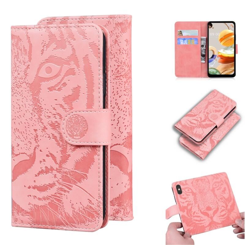 Θήκη δέρματος οριζόντιας αναδίπλωσης με ανάγλυφο σχέδιο τίγρης για LG K61 με βάση & υποδοχές καρτών & πορτοφόλι (Κόκκινο)