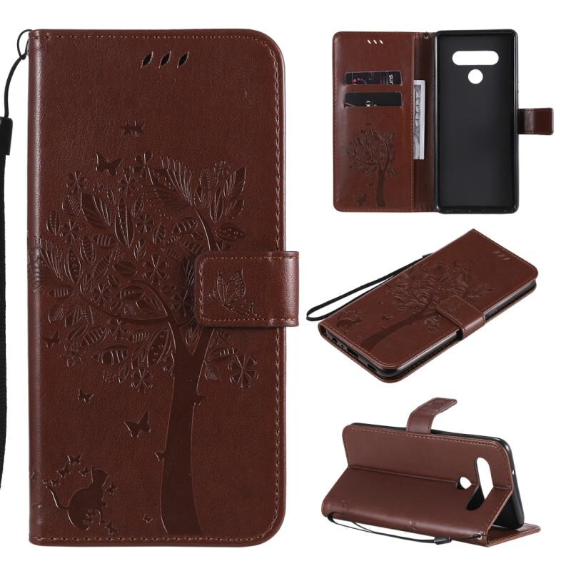 Θήκη για LG K61 με ανάγλυφο σχέδιο Δέντρου & Γάτας, οριζόντια, από δέρμα με βάση στήριξης, θήκες για κάρτες, πορτοφόλι & λουρί (Καφέ)