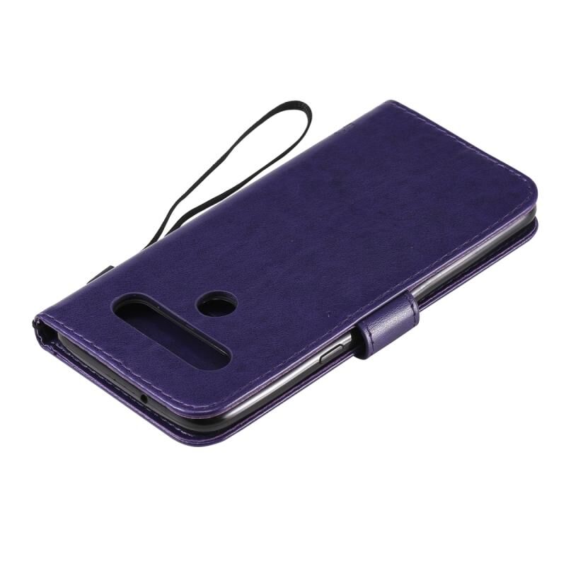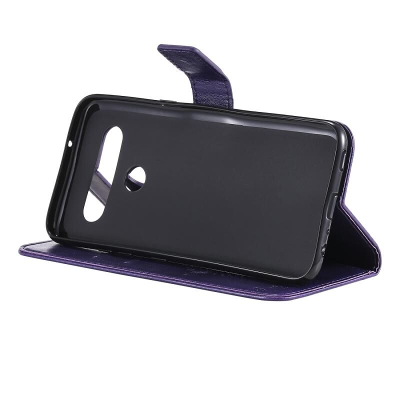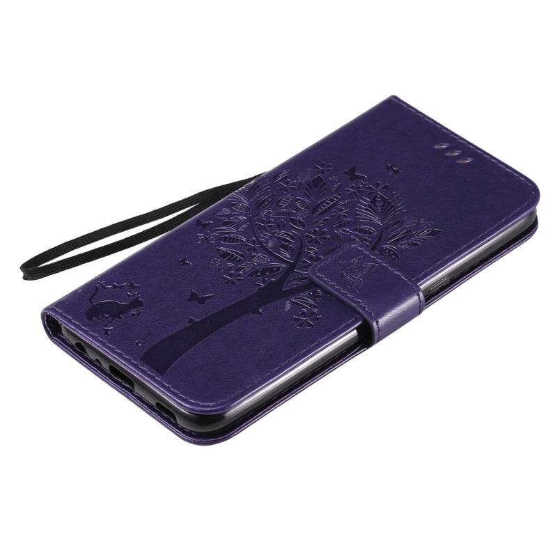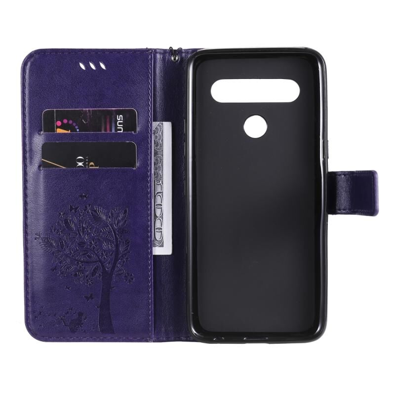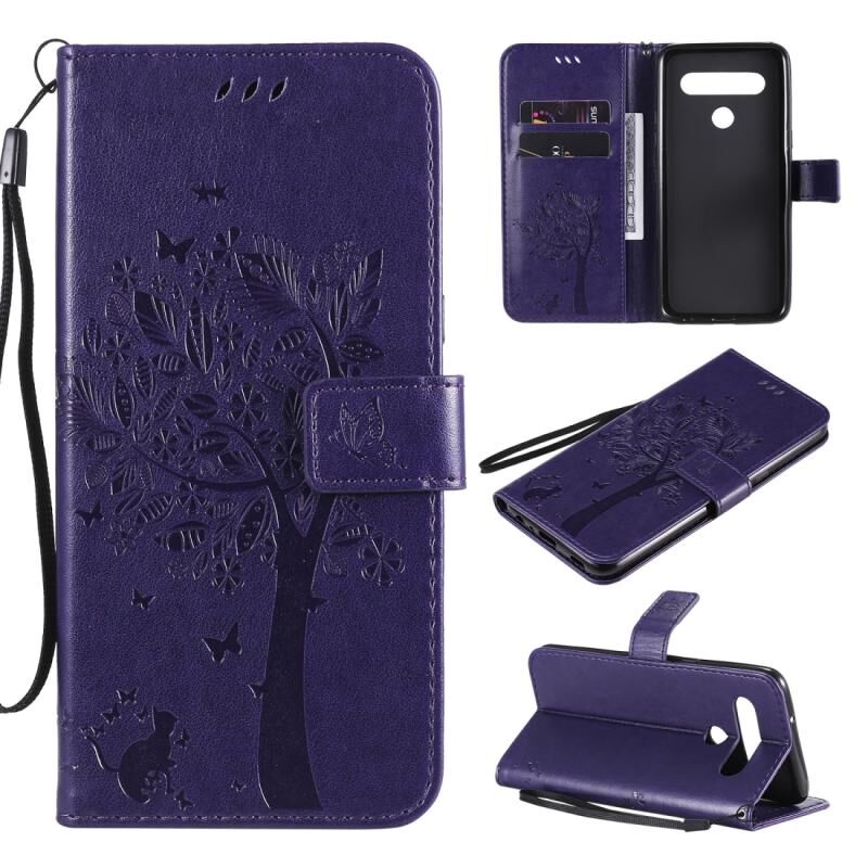 Θήκη για LG K61 με ανάγλυφο σχέδιο Δέντρου & Γάτας, οριζόντια, από δέρμα με βάση στήριξης, θήκες για κάρτες, πορτοφόλι & λουρί (Ανοιχτό Μωβ)