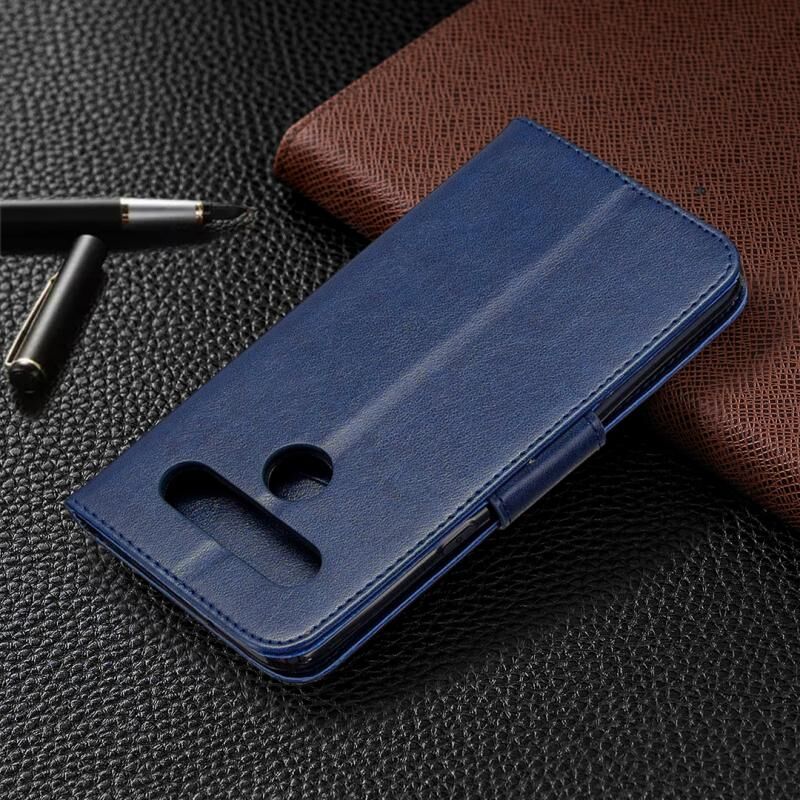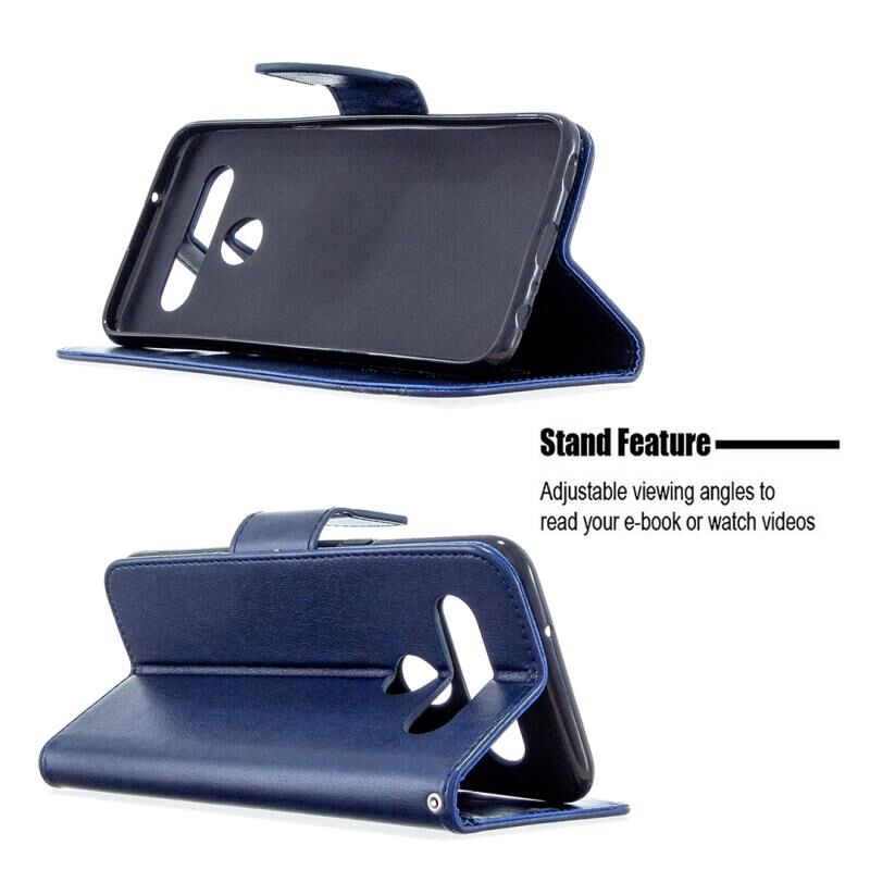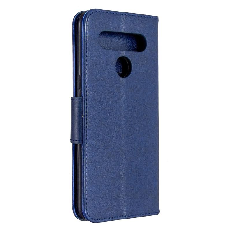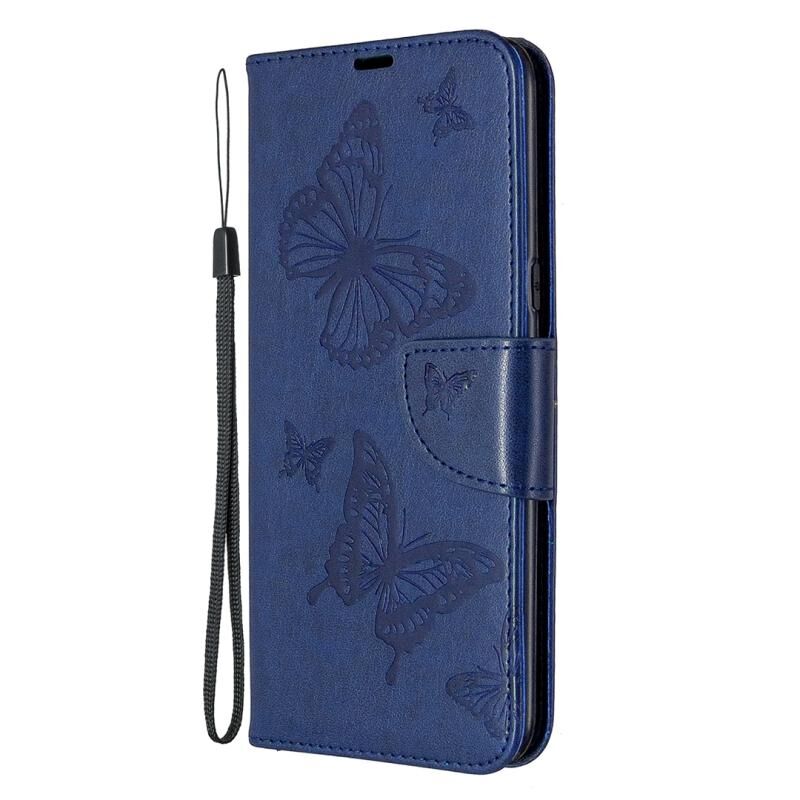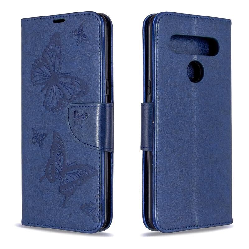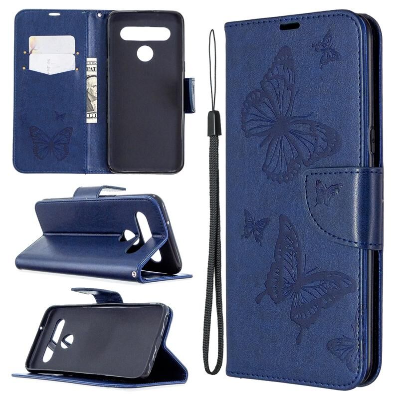 Θήκη δέρματος οριζόντιας αναδίπλωσης για LG K61 με σχέδιο δύο πεταλούδων σε ανάγλυφο, με βάση, θήκη καρτών, πορτοφόλι και λουρί (Σκούρο Μπλε)