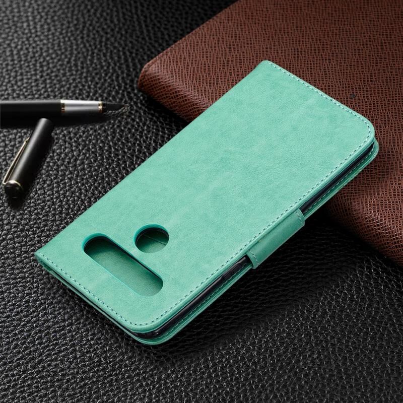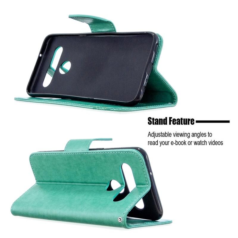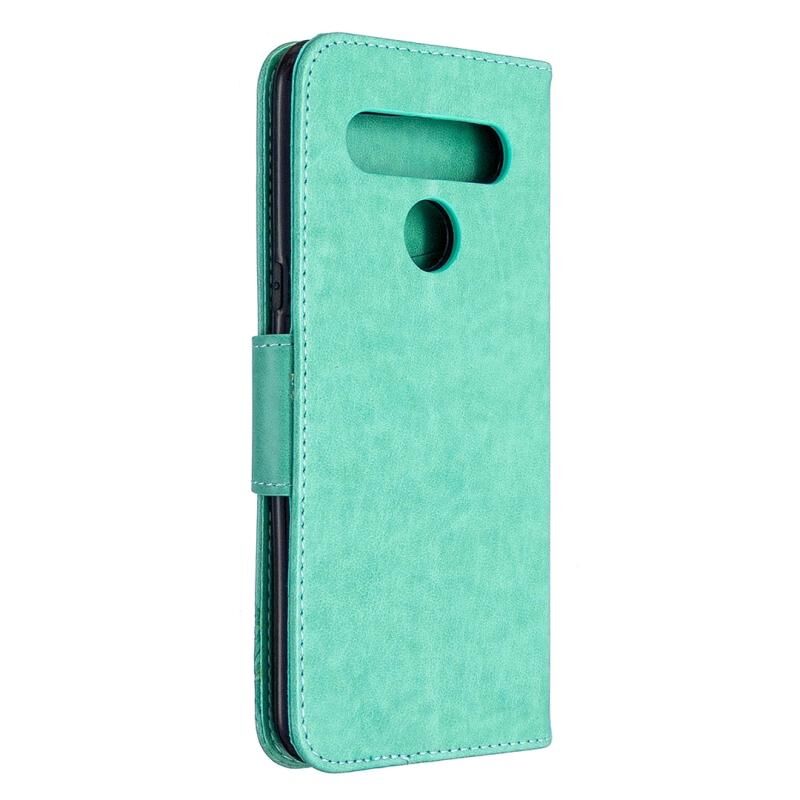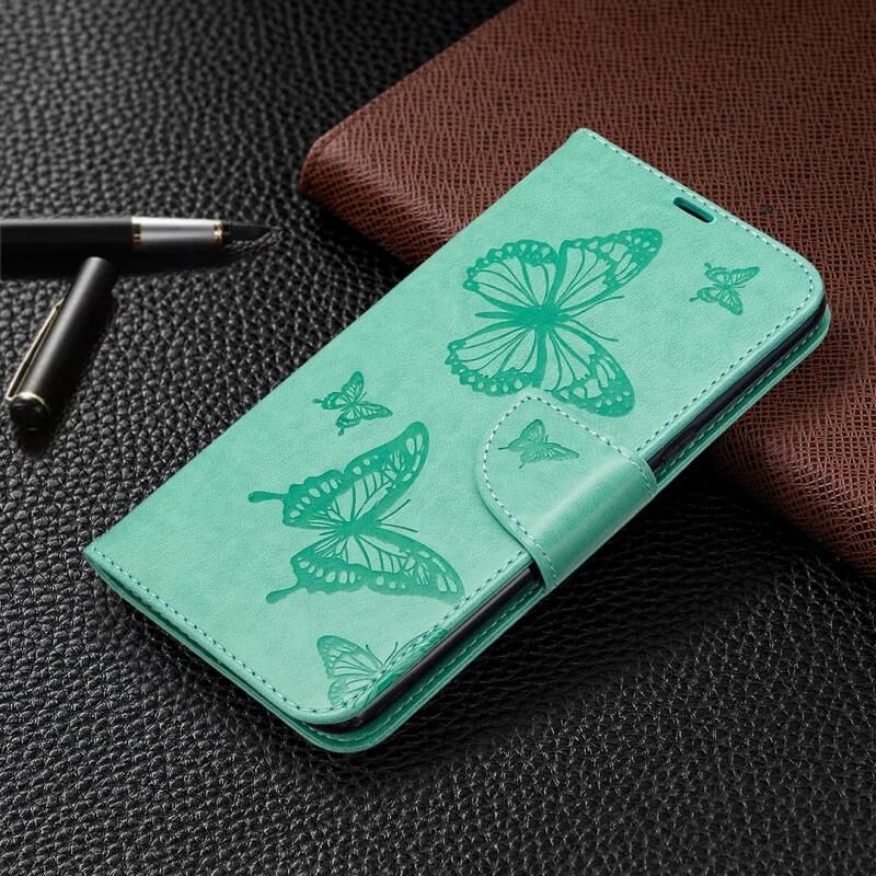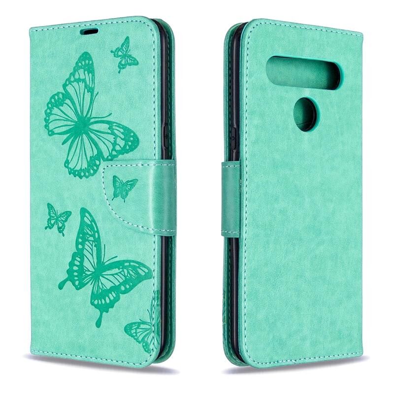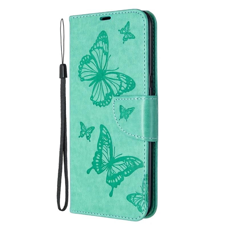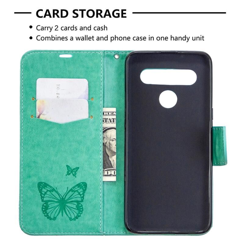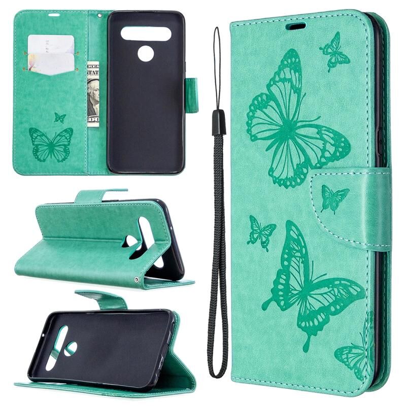 Θήκη δέρματος οριζόντιας αναδίπλωσης για LG K61 με σχέδιο δύο πεταλούδων σε ανάγλυφο, με βάση, θήκη καρτών, πορτοφόλι και λουρί (Χρυσό)