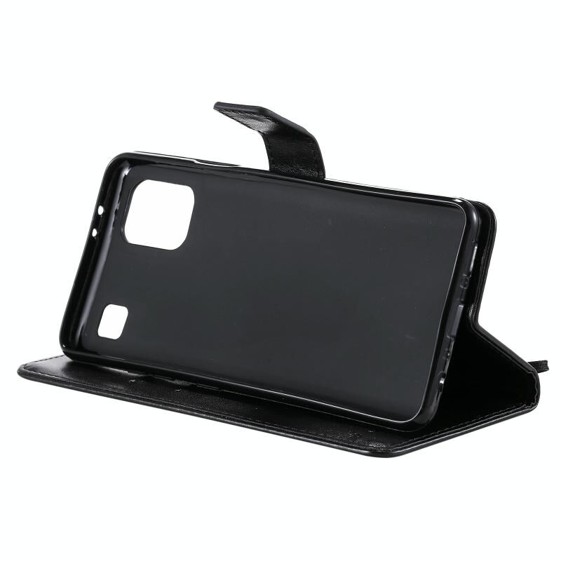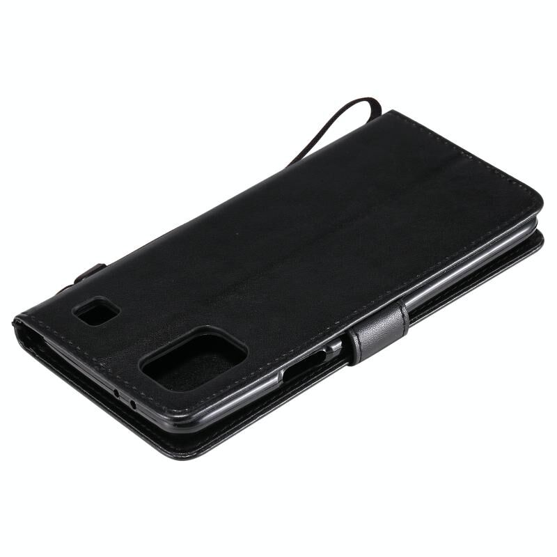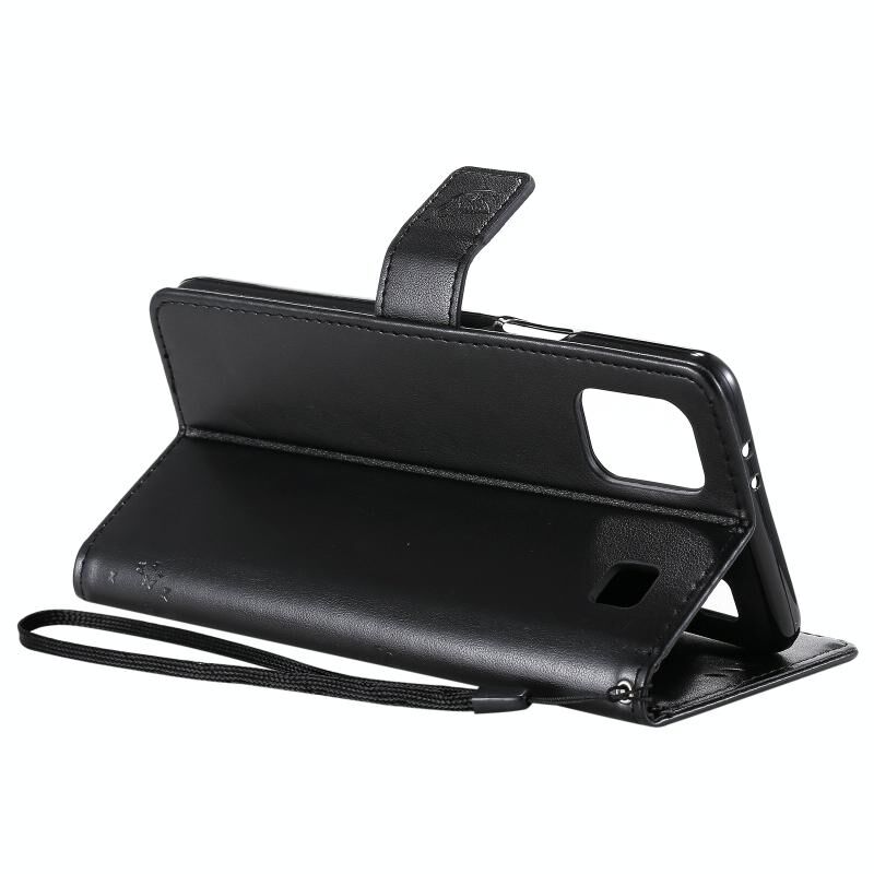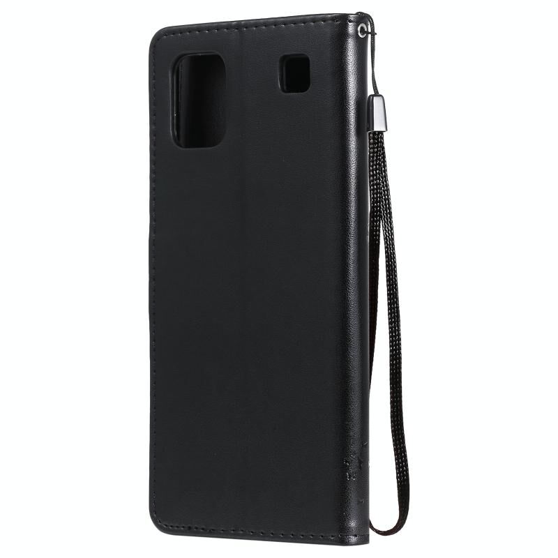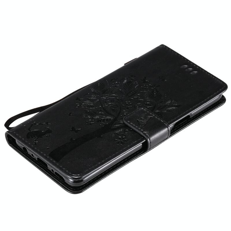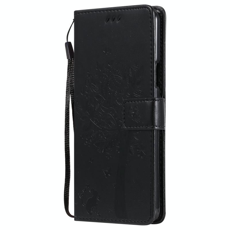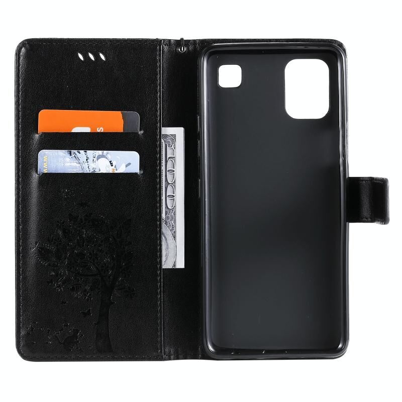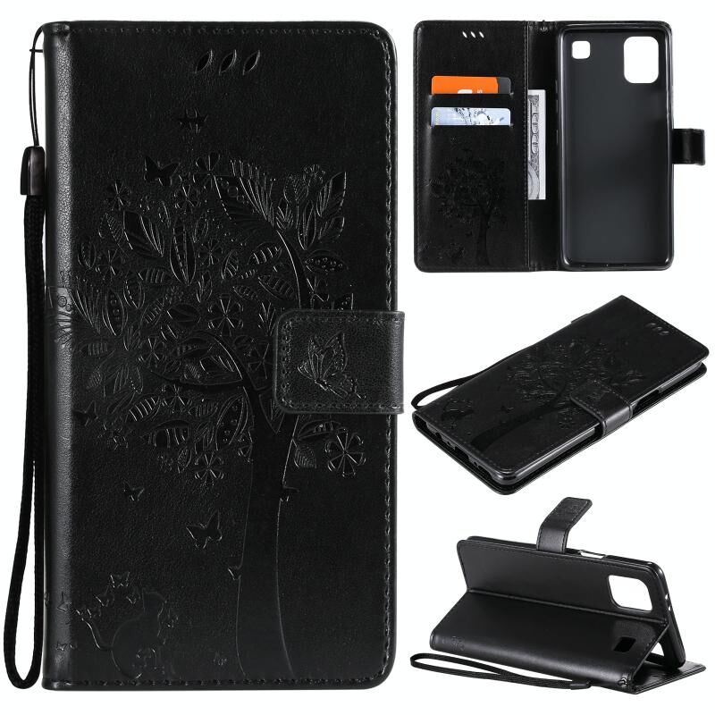 For LG K92 5G Tree & Cat Pattern Pressed Printing Horizontal Flip PU Leather Case with Holder & Card Slots & Wallet & Lanyard(Black)